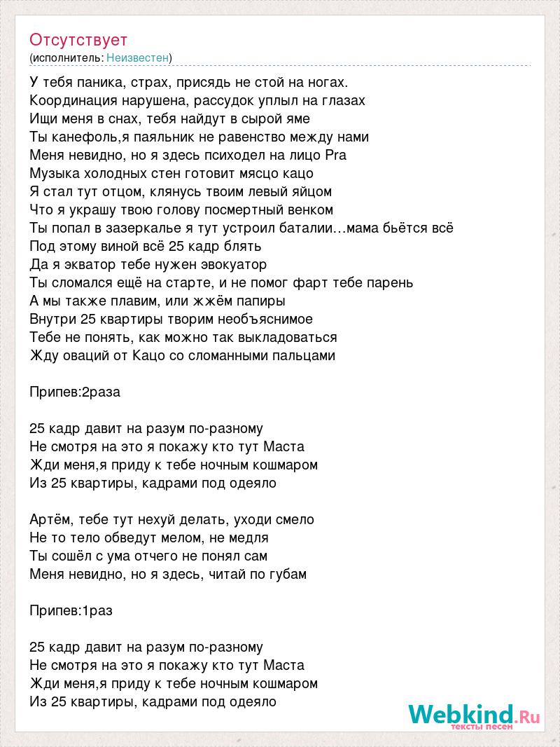 У тебя паника, страх, присядь не стой на ногах. Координация нарушена, рассудок уплыл на глазах Ищи меня в снах, тебя найдут в сырой яме Ты канефоль,я паяльник не равенство между нами Меня невидно, но я здесь психодел на лицо Pra Музыка холодных стен готовит мясцо кацо Я стал тут отцом, клянусь твоим левый яйцом Что я украшу твою голову посмертный венком Ты попал в зазеркалье я тут устроил баталии…мама бьётся всё Под этому виной всё 25 кадр блять Да я экватор тебе нужен эвокуатор Ты сломался ещё на старте, и не помог фарт тебе парень А мы также плавим, или жжём папиры Внутри 25 квартиры творим необъяснимое Тебе не понять, как можно так выкладоваться Жду оваций от Кацо со сломанными пальцами Припев:2раза 25 кадр давит на разум по-разному Не смотря на это я покажу кто тут Маста Жди меня,я приду к тебе ночным кошмаром Из 25 квартиры, кадрами под одеяло Артём, тебе тут нехуй делать, уходи смело Не то тело обведут мелом, не медля Ты сошёл с ума отчего не понял сам Меня невидно, но я здесь, читай по губам Припев:1раз 25 кадр давит на разум по-разному Не смотря на это я покажу кто тут Маста Жди меня,я приду к тебе ночным кошмаром Из 25 квартиры, кадрами под одеяло