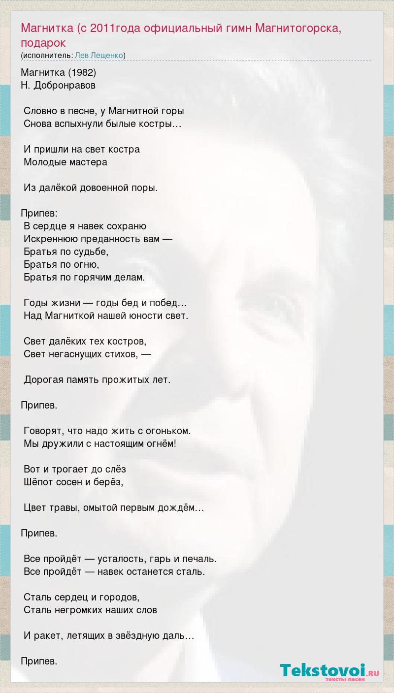 Главная→Исполнители→Лев Лещенко→Магнитка (с 2011года официальный гимн Магнитогорска, подарок А.Пахмутовой и Н.До
