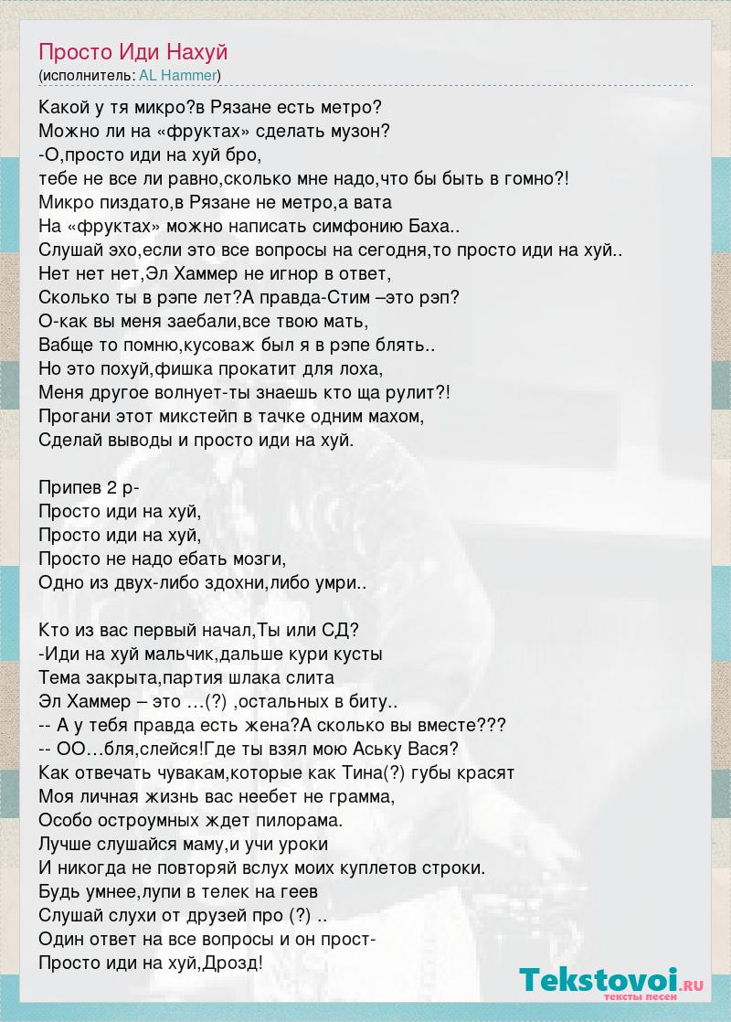 Какой у тя микро?в Рязане есть метро? Можно ли на «фруктах» сделать музон? -О,просто иди на хуй бро, тебе не все ли равно,сколько мне надо,что бы быть в гомно?! Микро пиздато,в Рязане не метро,а вата На «фруктах» можно написать симфонию Баха.. Слушай эхо,если это все вопросы на сегодня,то просто иди на хуй.. Нет нет нет,Эл Хаммер не игнор в ответ, Сколько ты в рэпе лет?А правда-Стим –это рэп? О-как вы меня заебали,все твою мать, Вабще то помню,кусоваж был я в рэпе блять.. Но это похуй,фишка прокатит для лоха, Меня другое волнует-ты знаешь кто ща рулит?! Прогани этот микстейп в тачке одним махом, Сделай выводы и просто иди на хуй. Припев 2 р- Просто иди на хуй, Просто иди на хуй, Просто не надо ебать мозги, Одно из двух-либо здохни,либо умри.. Кто из вас первый начал,Ты или СД? -Иди на хуй мальчик,дальше кури кусты Тема закрыта,партия шлака слита Эл Хаммер – это …(?) ,остальных в биту.. -- А у тебя правда есть жена?А сколько вы вместе??? -- ОО…бля,слейся!Где ты взял мою Аську Вася? Как отвечать чувакам,которые как Тина(?) губы красят Моя личная жизнь вас неебет не грамма, Особо остроумных ждет пилорама. Лучше слушайся маму,и учи уроки И никогда не повторяй вслух моих куплетов строки. Будь умнее,лупи в телек на геев Слушай слухи от друзей про (?) .. Один ответ на все вопросы и он прост- Просто иди на хуй,Дрозд!