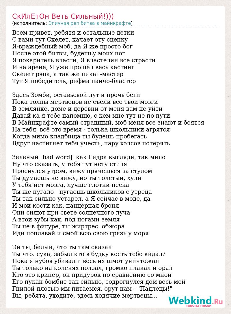 Всем привет, ребятя и остальные детки С вами тут Скелет, качает эту сценку Я-враждебный моб, да Я же просто бог После этой битвы, будешьу моих ног Я покаритель власти, Я властелин все страсти И на арене, Я уже прошёл весь кастинг Скелет рэпа, а так же пикап-мастер Тут Я победитель, рифма панчо-бластер Здесь Зомби, оставьсвой лут и прочь беги Пока толпы мертвецов не съели все твои мозги В землянке, доме и деревни от меня вам не уйти Давай ка я тебе напомню, с кем мне тут не по пути В Майнкрафте самый страшный, моб меня все знают и боятся На тебя, всё это время - толька школьники агрятся Когда мимо кладбища ты будешь пробегать Вдруг настигнет тебя учесть, пару хэлсов потерять Зелёный [bad word] как Гидра выгляди, так мило Ну что сказать, у тебя тут нету стиля Проснулся утром, вижу прячешься за стулом Ты думаешь не вижу, но ты толстый, хули У тебя нет мозга, лучше глотни песка Ты же пугало - пугаешь школьников с утреца Ты так сильно устарел, а Я сейчас в моде, да И мои кости как, панцерная броня Они сияют при свете солнечного луча А втои зубы как, под ногами земля Ты не в фигуре, ты жиртрес, обжора Иди поплавай и смой всю свою грязь у моря Эй ты, белый, что ты там сказал Ты что. сука, забыл кто в будку кость тебе кидал? Пока я нубов убивал и весь их шмот уничтожал Ты только на коленях ползал, громко плакал и орал Кто это крипер, он придурок по сравнению со мной Его пукан бомбит так сильно, содрогнулся дом весь мой Гнилой плотью мы питаемся, орут нам - "Падлецы!" Вы, ребята, уходите, здесь ходячие мертвецы...