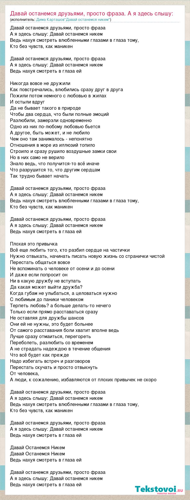 Главная→Исполнители→Дима Карташов"Давай останемся никем"→Давай останемся друзьями, просто фраза. А я здесь слышу: Давай останемся