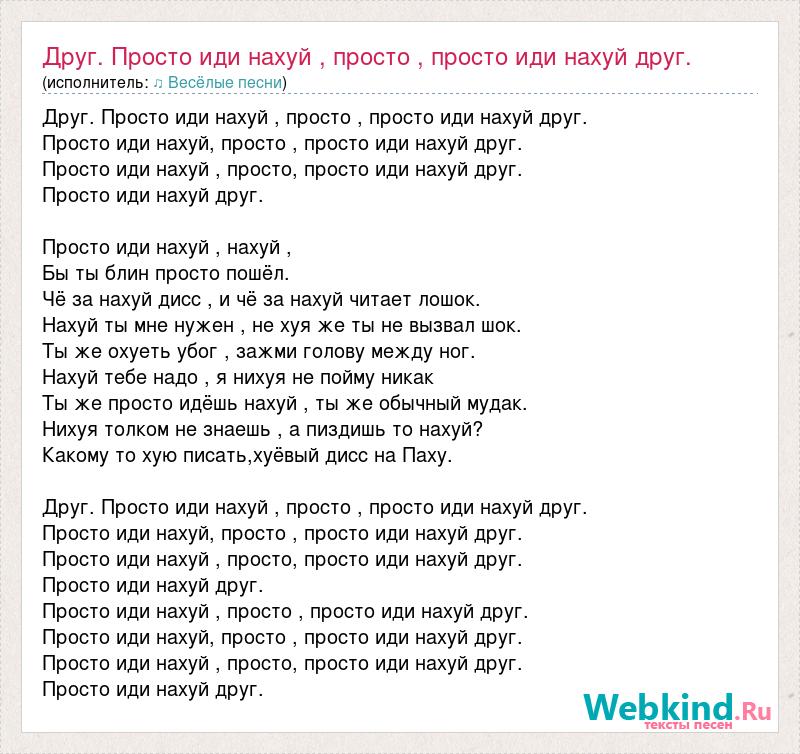 Друг. Просто иди нахуй , просто , просто иди нахуй друг. Просто иди нахуй, просто , просто иди нахуй друг. Просто иди нахуй , просто, просто иди нахуй друг. Просто иди нахуй друг. Просто иди нахуй , нахуй , Бы ты блин просто пошёл. Чё за нахуй дисс , и чё за нахуй читает лошок. Нахуй ты мне нужен , не хуя же ты не вызвал шок. Ты же охуеть убог , зажми голову между ног. Нахуй тебе надо , я нихуя не пойму никак Ты же просто идёшь нахуй , ты же обычный мудак. Нихуя толком не знаешь , а пиздишь то нахуй? Какому то хую писать,хуёвый дисс на Паху. Друг. Просто иди нахуй , просто , просто иди нахуй друг. Просто иди нахуй, просто , просто иди нахуй друг. Просто иди нахуй , просто, просто иди нахуй друг. Просто иди нахуй друг. Просто иди нахуй , просто , просто иди нахуй друг. Просто иди нахуй, просто , просто иди нахуй друг. Просто иди нахуй , просто, просто иди нахуй друг. Просто иди нахуй друг.