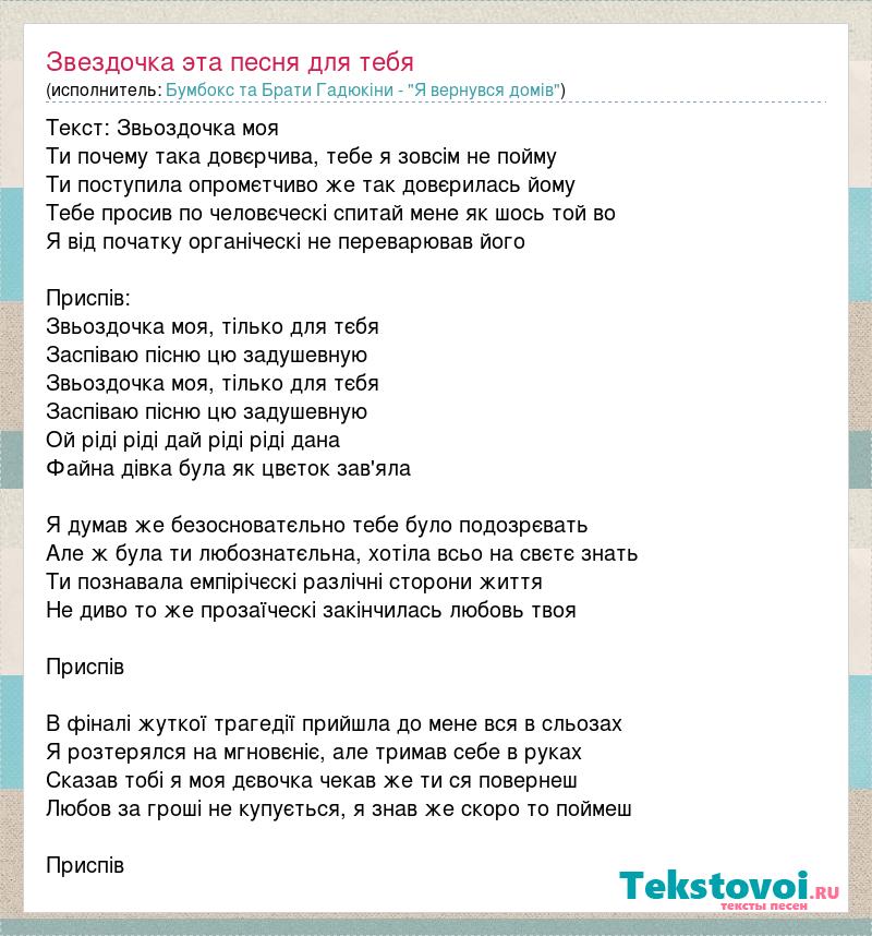Текст: Звьоздочка моя Ти почему така довєрчива, тебе я зовсім не пойму Ти поступила опромєтчиво же так довєрилась йому Тебе просив по человєческі спитай мене як шось той во Я від початку органіческі не переварював його Приспів: Звьоздочка моя, тілько для тєбя Заспіваю пісню цю задушевную Звьоздочка моя, тілько для тєбя Заспіваю пісню цю задушевную Ой ріді ріді дай ріді ріді дана Файна дівка була як цвєток зав'яла Я думав же безосноватєльно тебе було подозрєвать Але ж була ти любознатєльна, хотіла всьо на свєтє знать Ти познавала емпірічєскі разлічні сторони життя Hе диво то же прозаїческі закінчилась любовь твоя Приспів В фіналі жуткої трагедії прийшла до мене вся в сльозах Я розтерялся на мгновєніє, але тримав себе в руках Сказав тобі я моя дєвочка чекав же ти ся повернеш Любов за гроші не купується, я знав же скоро то поймеш Приспів
