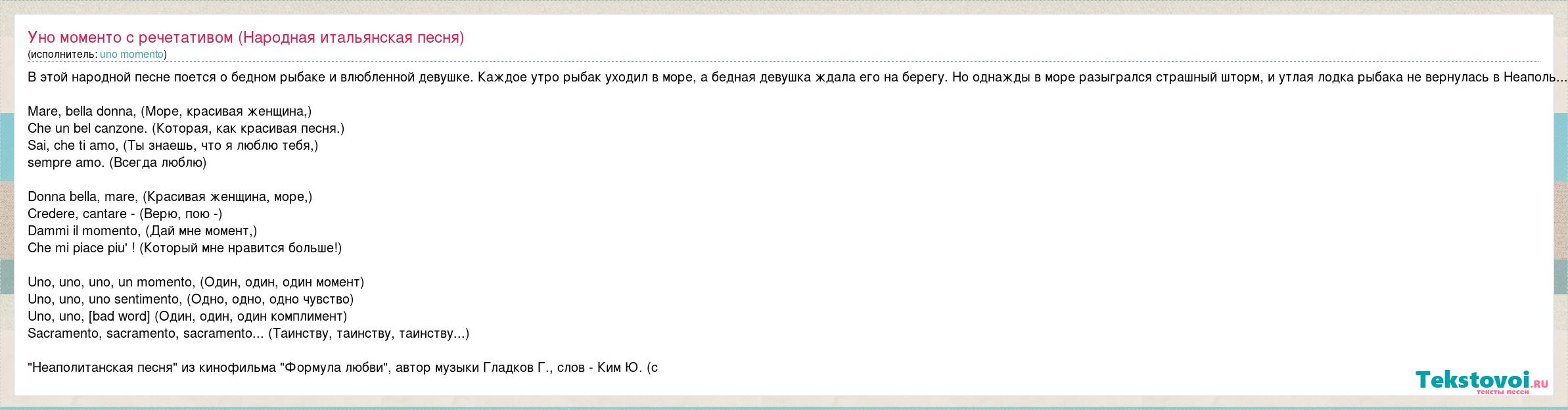 В этой народной песне поется о бедном рыбаке и влюбленной девушке. Каждое утро рыбак уходил в море, а бедная девушка ждала его на берегу. Но однажды в море разыгрался страшный шторм, и утлая лодка рыбака не вернулась в Неаполь... Mare, bella donna, (Море, красивая женщина,) Che un bel canzone. (Которая, как красивая песня.) Sai, che ti amo, (Ты знаешь, что я люблю тебя,) sempre amo. (Всегда люблю) Donna bella, mare, (Красивая женщина, море,) Credere, cantare - (Верю, пою -) Dammi il momento, (Дай мне момент,) Che mi piace piu' ! (Который мне нравится больше!) Uno, uno, uno, un momento, (Один, один, один момент) Uno, uno, uno sentimento, (Одно, одно, одно чувство) Uno, uno, uno complimento (Один, один, один комплимент) Sacramento, sacramento, sacramento... (Таинству, таинству, таинству...) "Неаполитанская песня" из кинофильма "Формула любви", автор музыки Гладков Г., слов - Ким Ю. (c