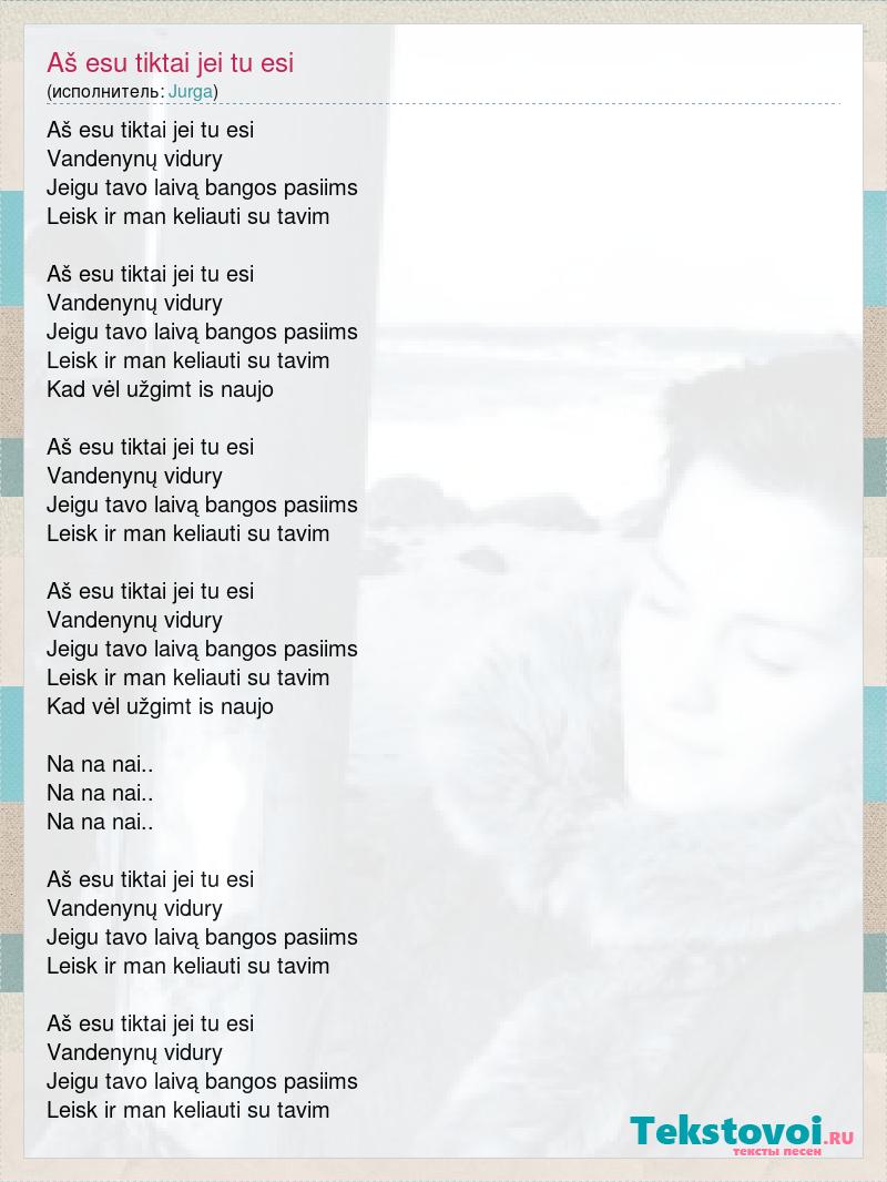 Aš esu tiktai jei tu esi Vandenynų vidury Jeigu tavo laivą bangos pasiims Leisk ir man keliauti su tavim Aš esu tiktai jei tu esi Vandenynų vidury Jeigu tavo laivą bangos pasiims Leisk ir man keliauti su tavim Kad vėl užgimt is naujo Aš esu tiktai jei tu esi Vandenynų vidury Jeigu tavo laivą bangos pasiims Leisk ir man keliauti su tavim Aš esu tiktai jei tu esi Vandenynų vidury Jeigu tavo laivą bangos pasiims Leisk ir man keliauti su tavim Kad vėl užgimt is naujo Na na nai.. Na na nai.. Na na nai.. Aš esu tiktai jei tu esi Vandenynų vidury Jeigu tavo laivą bangos pasiims Leisk ir man keliauti su tavim Aš esu tiktai jei tu esi Vandenynų vidury Jeigu tavo laivą bangos pasiims Leisk ir man keliauti su tavim