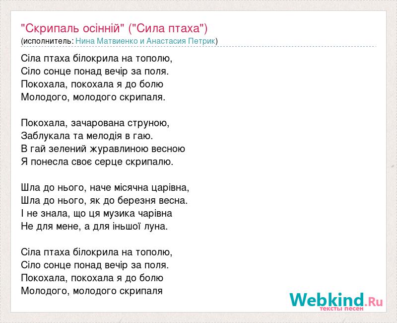 Сіла птаха білокрила на тополю, Сіло сонце понад вечір за поля. Покохала, покохала я до болю Молодого, молодого скрипаля. Покохала, зачарована струною, Заблукала та мелодія в гаю. В гай зелений журавлиною весною Я понесла своє серце скрипалю. Шла до нього, наче місячна царівна, Шла до нього, як до березня весна. І не знала, що ця музика чарівна Не для мене, а для іньшої луна. Сіла птаха білокрила на тополю, Сіло сонце понад вечір за поля. Покохала, покохала я до болю Молодого, молодого скрипаля