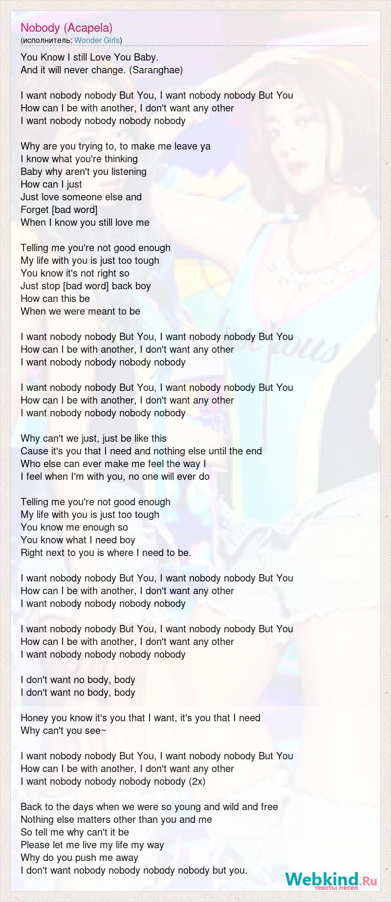 You Know I still Love You Baby. And it will never change. (Saranghae) I want nobody nobody But You, I want nobody nobody But You How can I be with another, I don't want any other I want nobody nobody nobody nobody Why are you trying to, to make me leave ya I know what you're thinking Baby why aren't you listening How can I just Just love someone else and Forget [bad word] When I know you still love me Telling me you're not good enough My life with you is just too tough You know it's not right so Just stop [bad word] back boy How can this be When we were meant to be I want nobody nobody But You, I want nobody nobody But You How can I be with another, I don't want any other I want nobody nobody nobody nobody I want nobody nobody But You, I want nobody nobody But You How can I be with another, I don't want any other I want nobody nobody nobody nobody Why can't we just, just be like this Cause it's you that I need and nothing else until the end Who else can ever make me feel the way I I feel when I'm with you, no one will ever do Telling me you're not good enough My life with you is just too tough You know me enough so You know what I need boy Right next to you is where I need to be. I want nobody nobody But You, I want nobody nobody But You How can I be with another, I don't want any other I want nobody nobody nobody nobody I want nobody nobody But You, I want nobody nobody But You How can I be with another, I don't want any other I want nobody nobody nobody nobody I don't want no body, body I don't want no body, body Honey you know it's you that I want, it's you that I need Why can't you see~ I want nobody nobody But You, I want nobody nobody But You How can I be with another, I don't want any other I want nobody nobody nobody nobody (2x) Back to the days when we were so young and wild and free Nothing else matters other than you and me So tell me why can't it be Please let me live my life my way Why do you push me away I don't want nobody nobody nobody nobody but you.