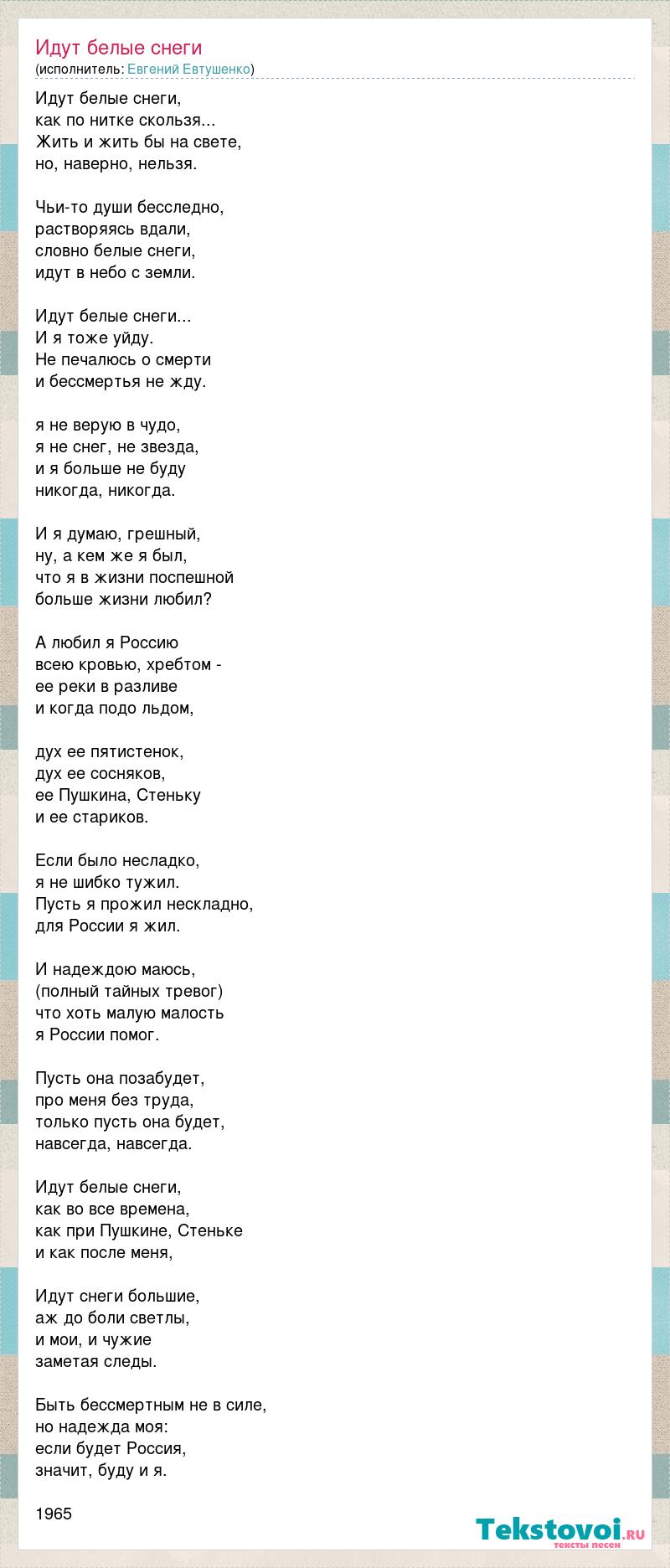 Идут белые снеги, как по нитке скользя... Жить и жить бы на свете, но, наверно, нельзя. Чьи-то души бесследно, растворяясь вдали, словно белые снеги, идут в небо с земли. Идут белые снеги... И я тоже уйду. Не печалюсь о смерти и бессмертья не жду. я не верую в чудо, я не снег, не звезда, и я больше не буду никогда, никогда. И я думаю, грешный, ну, а кем же я был, что я в жизни поспешной больше жизни любил? А любил я Россию всею кровью, хребтом - ее реки в разливе и когда подо льдом, дух ее пятистенок, дух ее сосняков, ее Пушкина, Стеньку и ее стариков. Если было несладко, я не шибко тужил. Пусть я прожил нескладно, для России я жил. И надеждою маюсь, (полный тайных тревог) что хоть малую малость я России помог. Пусть она позабудет, про меня без труда, только пусть она будет, навсегда, навсегда. Идут белые снеги, как во все времена, как при Пушкине, Стеньке и как после меня, Идут снеги большие, аж до боли светлы, и мои, и чужие заметая следы. Быть бессмертным не в силе, но надежда моя: если будет Россия, значит, буду и я. 1965