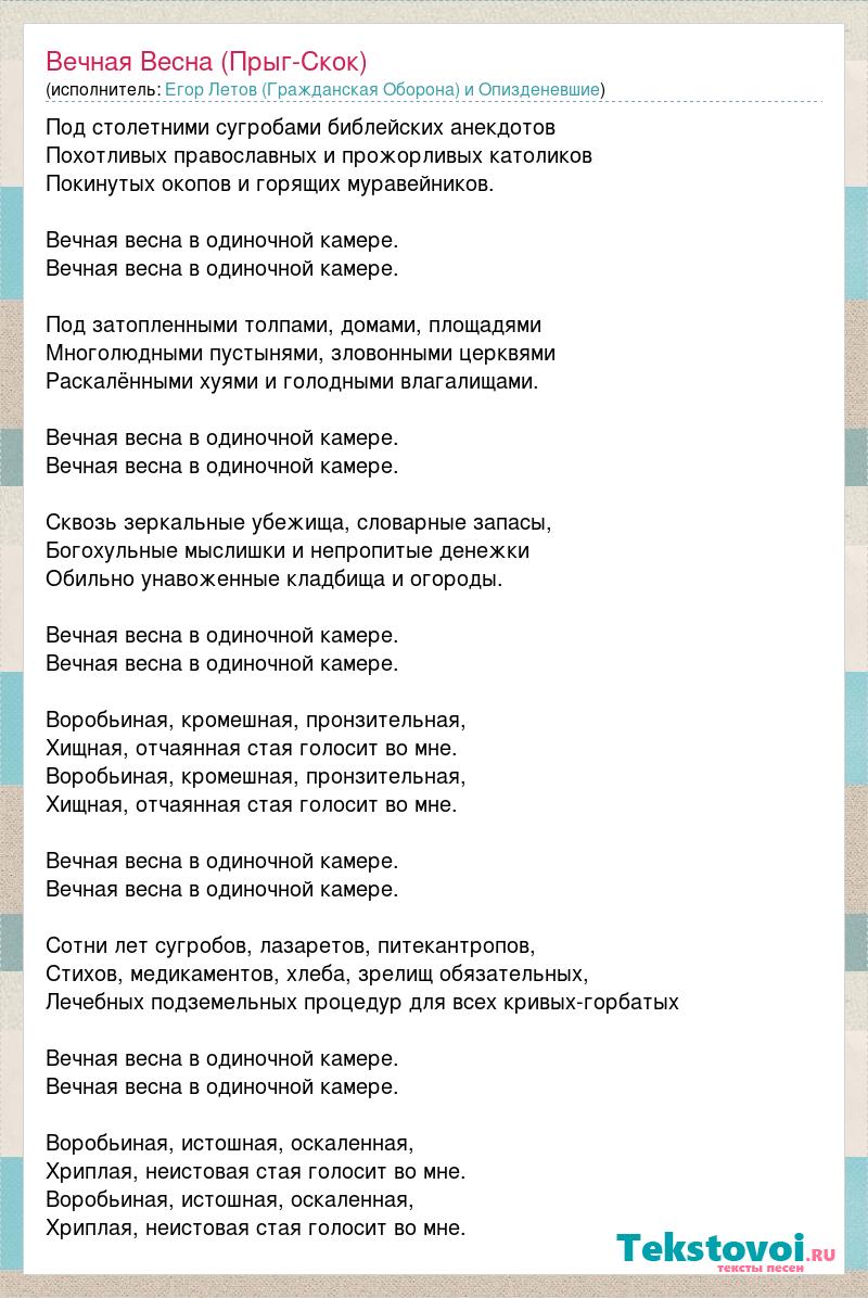 Под столетними сугробами библейских анекдотов Похотливых православных и прожорливых католиков Покинутых окопов и горящих муравейников. Вечная весна в одиночной камере. Вечная весна в одиночной камере. Под затопленными толпами, домами, площадями Многолюдными пустынями, зловонными церквями Раскалёнными хуями и голодными влагалищами. Вечная весна в одиночной камере. Вечная весна в одиночной камере. Сквозь зеркальные убежища, словарные запасы, Богохульные мыслишки и непропитые денежки Обильно унавоженные кладбища и огороды. Вечная весна в одиночной камере. Вечная весна в одиночной камере. Воробьиная, кромешная, пронзительная, Хищная, отчаянная стая голосит во мне. Воробьиная, кромешная, пронзительная, Хищная, отчаянная стая голосит во мне. Вечная весна в одиночной камере. Вечная весна в одиночной камере. Сотни лет сугробов, лазаретов, питекантропов, Стихов, медикаментов, хлеба, зрелищ обязательных, Лечебных подземельных процедур для всех кривых-горбатых Вечная весна в одиночной камере. Вечная весна в одиночной камере. Воробьиная, истошная, оскаленная, Хриплая, неистовая стая голосит во мне. Воробьиная, истошная, оскаленная, Хриплая, неистовая стая голосит во мне.