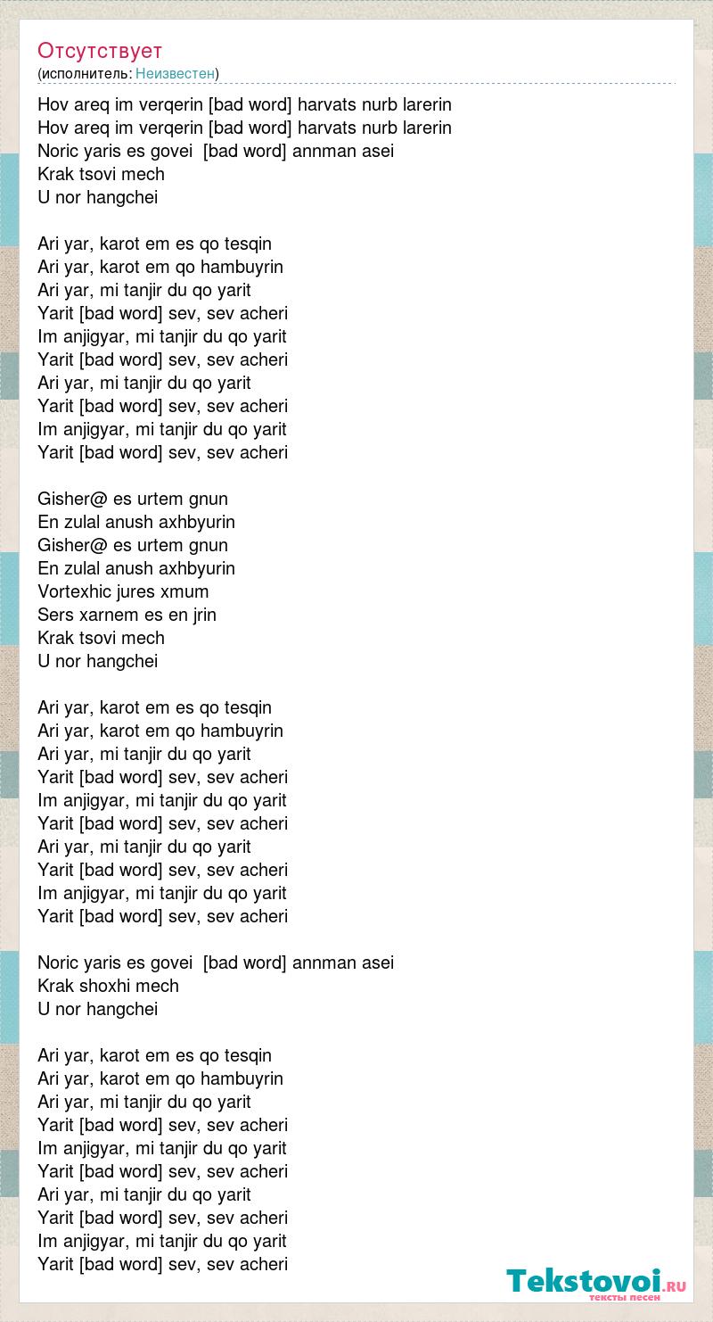 Hov areq im verqerin Siruc harvats nurb larerin Hov areq im verqerin Siruc harvats nurb larerin Noric yaris es govei Sirun annman asei Krak tsovi mech U nor hangchei Ari yar, karot em es qo tesqin Ari yar, karot em qo hambuyrin Ari yar, mi tanjir du qo yarit Yarit sirun sev, sev acheri Im anjigyar, mi tanjir du qo yarit Yarit sirun sev, sev acheri Ari yar, mi tanjir du qo yarit Yarit sirun sev, sev acheri Im anjigyar, mi tanjir du qo yarit Yarit sirun sev, sev acheri Gisher@ es urtem gnun En zulal anush axhbyurin Gisher@ es urtem gnun En zulal anush axhbyurin Vortexhic jures xmum Sers xarnem es en jrin Krak tsovi mech U nor hangchei Ari yar, karot em es qo tesqin Ari yar, karot em qo hambuyrin Ari yar, mi tanjir du qo yarit Yarit sirun sev, sev acheri Im anjigyar, mi tanjir du qo yarit Yarit sirun sev, sev acheri Ari yar, mi tanjir du qo yarit Yarit sirun sev, sev acheri Im anjigyar, mi tanjir du qo yarit Yarit sirun sev, sev acheri Noric yaris es govei Sirun annman asei Krak shoxhi mech U nor hangchei Ari yar, karot em es qo tesqin Ari yar, karot em qo hambuyrin Ari yar, mi tanjir du qo yarit Yarit sirun sev, sev acheri Im anjigyar, mi tanjir du qo yarit Yarit sirun sev, sev acheri Ari yar, mi tanjir du qo yarit Yarit sirun sev, sev acheri Im anjigyar, mi tanjir du qo yarit Yarit sirun sev, sev acheri