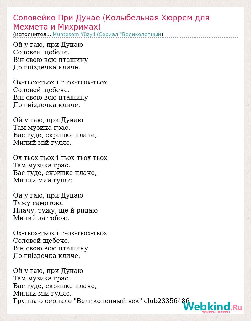 Ой у гаю, при Дунаю Соловей щебече. Він свою всю пташину До гніздечка кличе. Ох-тьох-тьох і тьох-тьох-тьох Соловей щебече. Він свою всю пташину До гніздечка кличе. Ой у гаю, при Дунаю Там музика грає. Бас гуде, скрипка плаче, Милий мій гуляє. Ох-тьох-тьох і тьох-тьох-тьох Там музика грає. Бас гуде, скрипка плаче, Милий мий гуляє. Ой у гаю, при Дунаю Тужу самотою. Плачу, тужу, ще й ридаю Милий за тобою. Ох-тьох-тьох і тьох-тьох-тьох Соловей щебече. Він свою всю пташину До гніздечка кличе. Ой у гаю, при Дунаю Там музика грає. Бас гуде, скрипка плаче, Милий мій гуляє. Группа о сериале "Великолепный век" club23356486