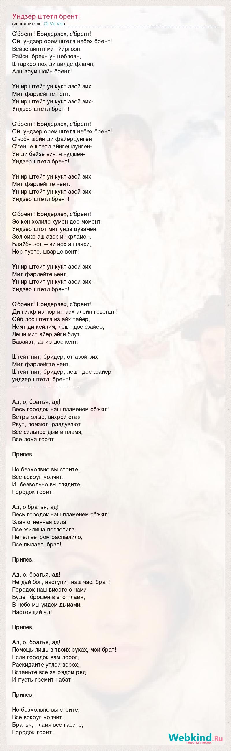 С’брент! Бридерлех, с’брент! Ой, ундзер орем штетл небех брент! Вейзе винтн мит йиргозн Райсн, брехн ун цеблозн, Штаркер нох ди вилде фламн, Алц арум шойн брент! Ун ир штейт ун кукт азой зих Мит фарлейгте һент. Ун ир штейт ун кукт азой зих- Ундзер штетл брент! С’брент! Бридерлех, с’брент! Ой, ундзер орем штетл небех брент! С’һобн шойн ди файерцунген С’генце штетл айнгешлунген- Ун ди бейзе винтн һудшен- Ундзер штетл брент! Ун ир штейт ун кукт азой зих Мит фарлейгте һент. Ун ир штейт ун кукт азой зих- Ундзер штетл брент! С’брент! Бридерлех, с’брент! Эс кен холиле кумен дер момент Ундзер штот мит ундз цузамен Зол ойф аш авек ин фламен, Блайбн зол – ви нох а шлахи, Нор пусте, шварце вент! Ун ир штейт ун кукт азой зих Мит фарлейте һент. Ун ир штейт ун кукт азой зих- Ундзер штетл брент! С’брент! Бридерлех, с’брент! Ди һилф из нор ин айх алейн гевендт! Ойб дос штетл из айх тайер, Немт ди кейлим, лешт дос файер, Лешн мит айер эйгн блут, Бавайзт, аз ир дос кент. Штейт нит, бридер, от азой зих Мит фарлейгте һент. Штейт нит, бридер, лешт дос файер- ундзер штетл, брент! ---------------------------------- Ад, о, братья, ад! Весь городок наш пламенем объят! Ветры злые, вихрей стая Рвут, ломают, раздувают Все сильнее дым и пламя, Все дома горят. Припев: Но безмолвно вы стоите, Все вокруг молчит. И безвольно вы глядите, Городок горит! Ад, о братья, ад! Весь городок наш пламенем объят! Злая огненная сила Все жилища поглотила, Пепел ветром распылило, Все пылает, брат! Припев. Ад, о, братья, ад! Не дай бог, наступит наш час, брат! Городок наш вместе с нами Будет брошен в это пламя, В небо мы уйдем дымами. Настоящий ад! Припев. Ад, о, братья, ад! Помощь лишь в твоих руках, мой брат! Если городок вам дорог, Раскидайте углей ворох, Встаньте все за рядом ряд, И пусть гремит набат! Припев: Но безмолвно вы стоите, Все вокруг молчит. Братья, пламя все гасите, Городок горит!