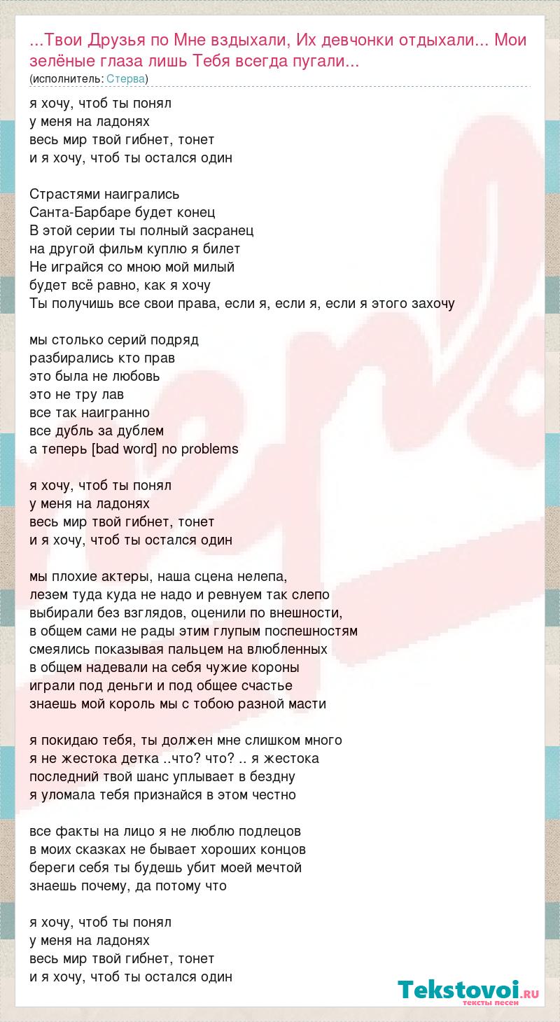 я хочу, чтоб ты понял у меня на ладонях весь мир твой гибнет, тонет и я хочу, чтоб ты остался один Страстями наигрались Санта-Барбаре будет конец В этой серии ты полный засранец на другой фильм куплю я билет Не играйся со мною мой милый будет всё равно, как я хочу Ты получишь все свои права, если я, если я, если я этого захочу мы столько серий подряд разбирались кто прав это была не любовь это не тру лав все так наигранно все дубль за дублем а теперь [bad word] no problems я хочу, чтоб ты понял у меня на ладонях весь мир твой гибнет, тонет и я хочу, чтоб ты остался один мы плохие актеры, наша сцена нелепа, лезем туда куда не надо и ревнуем так слепо выбирали без взглядов, оценили по внешности, в общем сами не рады этим глупым поспешностям смеялись показывая пальцем на влюбленных в общем надевали на себя чужие короны играли под деньги и под общее счастье знаешь мой король мы с тобою разной масти я покидаю тебя, ты должен мне слишком много я не жестока детка ..что? что? .. я жестока последний твой шанс уплывает в бездну я уломала тебя признайся в этом честно все факты на лицо я не люблю подлецов в моих сказках не бывает хороших концов береги себя ты будешь убит моей мечтой знаешь почему, да потому что я хочу, чтоб ты понял у меня на ладонях весь мир твой гибнет, тонет и я хочу, чтоб ты остался один