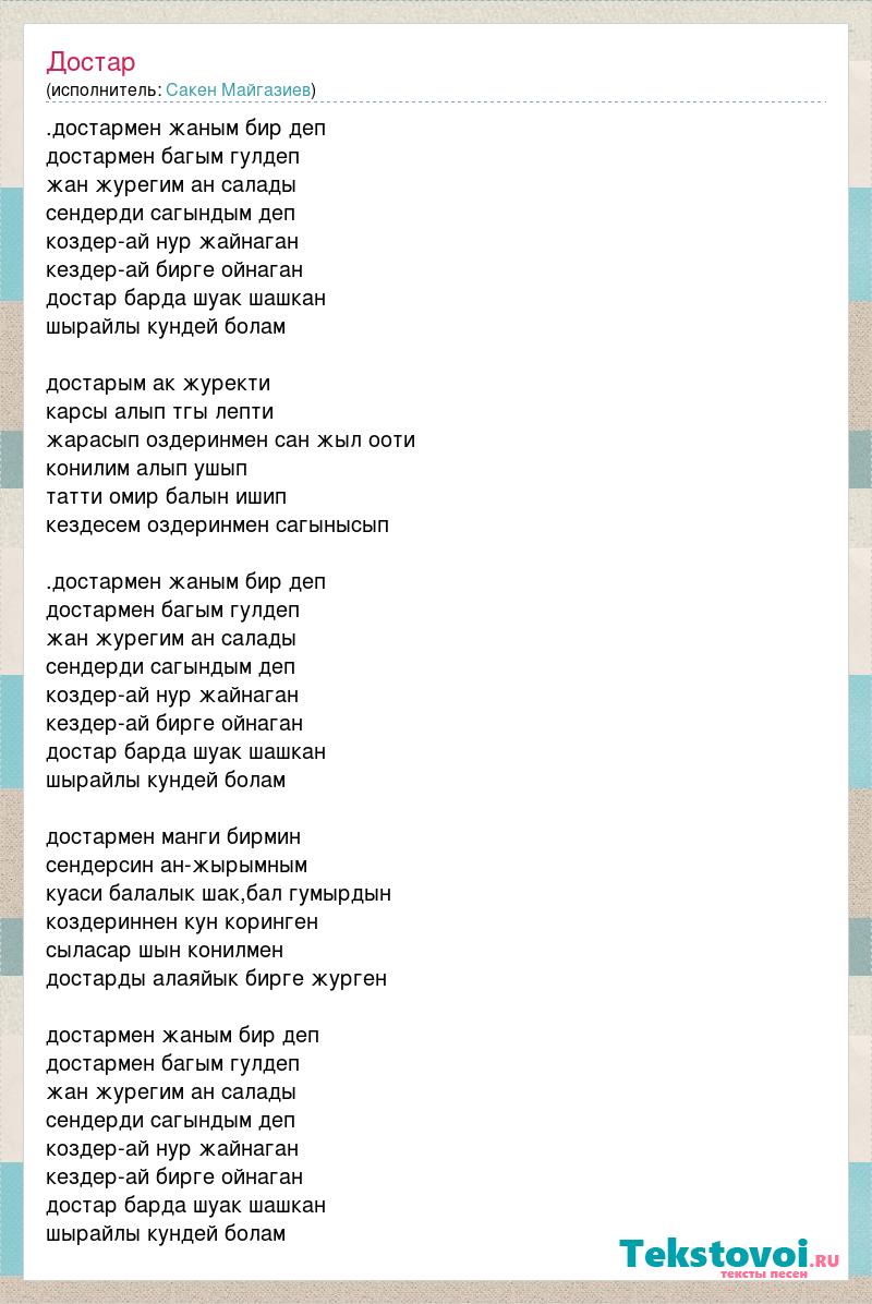 .достармен жаным бир деп достармен багым гулдеп жан журегим ан салады сендерди сагындым деп коздер-ай нур жайнаган кездер-ай бирге ойнаган достар барда шуак шашкан шырайлы кундей болам достарым ак журекти карсы алып тгы лепти жарасып оздеринмен сан жыл ооти конилим алып ушып татти омир балын ишип кездесем оздеринмен сагынысып .достармен жаным бир деп достармен багым гулдеп жан журегим ан салады сендерди сагындым деп коздер-ай нур жайнаган кездер-ай бирге ойнаган достар барда шуак шашкан шырайлы кундей болам достармен манги бирмин сендерсин ан-жырымным куаси балалык шак,бал гумырдын коздериннен кун коринген сыласар шын конилмен достарды алаяйык бирге журген достармен жаным бир деп достармен багым гулдеп жан журегим ан салады сендерди сагындым деп коздер-ай нур жайнаган кездер-ай бирге ойнаган достар барда шуак шашкан шырайлы кундей болам
