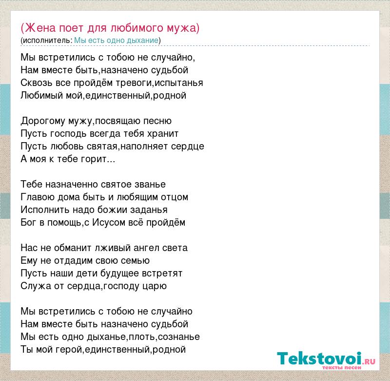 Мы встретились с тобою не случайно, Нам вместе быть,назначено судьбой Сквозь все пройдём тревоги,испытанья Любимый мой,единственный,родной Дорогому мужу,посвящаю песню Пусть господь всегда тебя хранит Пусть любовь святая,наполняет сердце А моя к тебе горит... Тебе назначенно святое званье Главою дома быть и любящим отцом Исполнить надо божии заданья Бог в помощь,с Исусом всё пройдём Нас не обманит лживый ангел света Ему не отдадим свою семью Пусть наши дети будущее встретят Служа от сердца,господу царю Мы встретились с тобою не случайно Нам вместе быть назначено судьбой Мы есть одно дыханье,плоть,сознанье Ты мой герой,единственный,родной