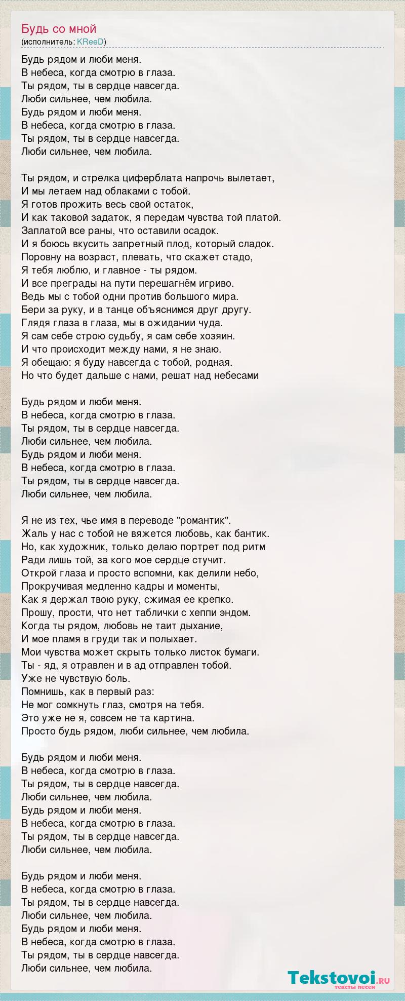 Будь рядом и люби меня. В небеса, когда смотрю в глаза. Ты рядом, ты в сердце навсегда. Люби сильнее, чем любила. Будь рядом и люби меня. В небеса, когда смотрю в глаза. Ты рядом, ты в сердце навсегда. Люби сильнее, чем любила. Ты рядом, и стрелка циферблата напрочь вылетает, И мы летаем над облаками с тобой. Я готов прожить весь свой остаток, И как таковой задаток, я передам чувства той платой. Заплатой все раны, что оставили осадок. И я боюсь вкусить запретный плод, который сладок. Поровну на возраст, плевать, что скажет стадо, Я тебя люблю, и главное - ты рядом. И все преграды на пути перешагнём игриво. Ведь мы с тобой одни против большого мира. Бери за руку, и в танце объяснимся друг другу. Глядя глаза в глаза, мы в ожидании чуда. Я сам себе строю судьбу, я сам себе хозяин. И что происходит между нами, я не знаю. Я обещаю: я буду навсегда с тобой, родная. Но что будет дальше с нами, решат над небесами Будь рядом и люби меня. В небеса, когда смотрю в глаза. Ты рядом, ты в сердце навсегда. Люби сильнее, чем любила. Будь рядом и люби меня. В небеса, когда смотрю в глаза. Ты рядом, ты в сердце навсегда. Люби сильнее, чем любила. Я не из тех, чье имя в переводе "романтик". Жаль у нас с тобой не вяжется любовь, как бантик. Но, как художник, только делаю портрет под ритм Ради лишь той, за кого мое сердце стучит. Открой глаза и просто вспомни, как делили небо, Прокручивая медленно кадры и моменты, Как я держал твою руку, сжимая ее крепко. Прошу, прости, что нет таблички с хеппи эндом. Когда ты рядом, любовь не таит дыхание, И мое пламя в груди так и полыхает. Мои чувства может скрыть только листок бумаги. Ты - яд, я отравлен и в ад отправлен тобой. Уже не чувствую боль. Помнишь, как в первый раз: Не мог сомкнуть глаз, смотря на тебя. Это уже не я, совсем не та картина. Просто будь рядом, люби сильнее, чем любила. Будь рядом и люби меня. В небеса, когда смотрю в глаза. Ты рядом, ты в сердце навсегда. Люби сильнее, чем любила. Будь рядом и люби меня. В небеса, когда смотрю в глаза. Ты рядом, ты в сердце навсегда. Люби сильнее, чем любила. Будь рядом и люби меня. В небеса, когда смотрю в глаза. Ты рядом, ты в сердце навсегда. Люби сильнее, чем любила. Будь рядом и люби меня. В небеса, когда смотрю в глаза. Ты рядом, ты в сердце навсегда. Люби сильнее, чем любила.