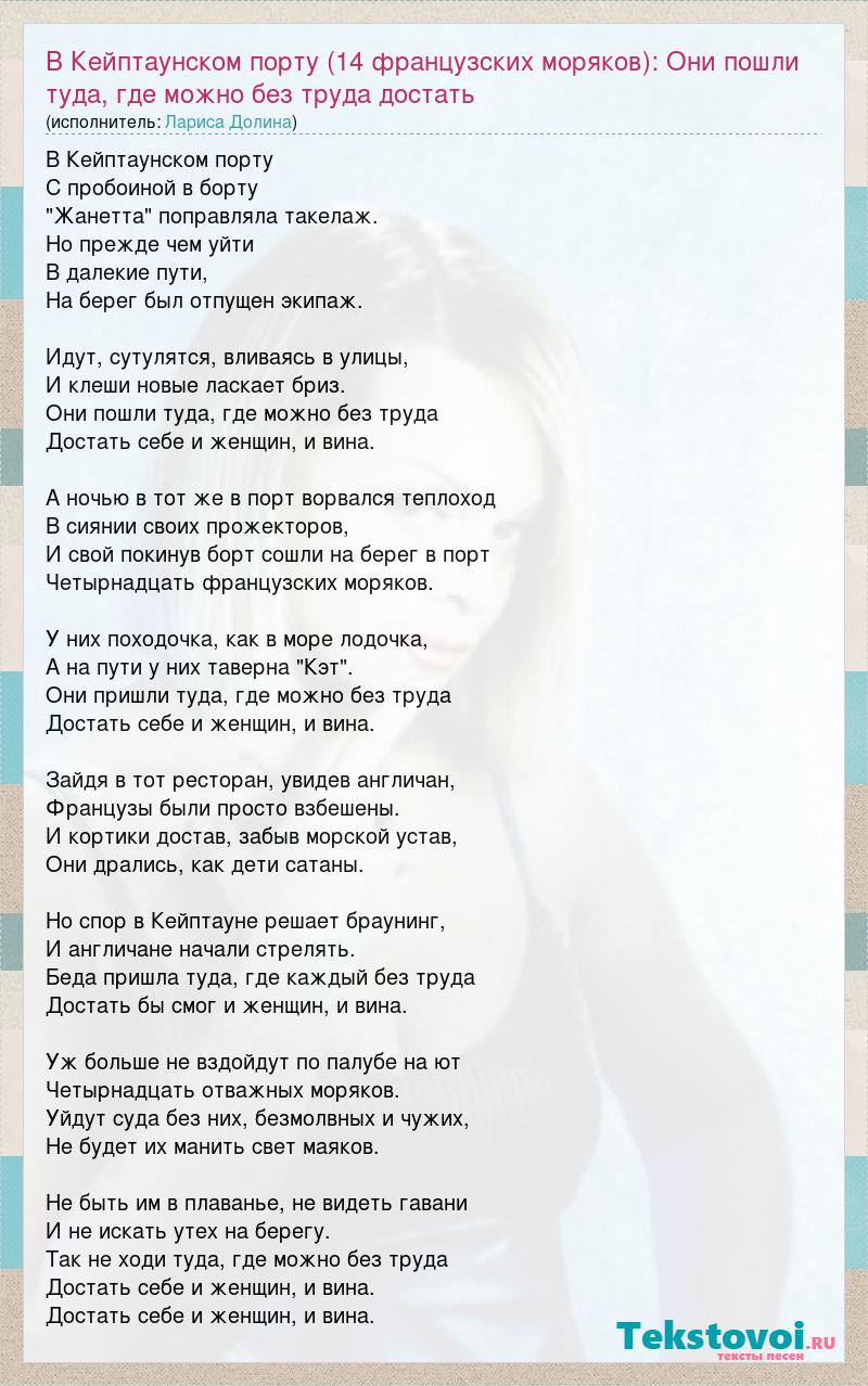 В Кейптаунском порту С пробоиной в борту "Жанетта" поправляла такелаж. Но прежде чем уйти В далекие пути, На берег был отпущен экипаж. Идут, сутулятся, вливаясь в улицы, И клеши новые ласкает бриз. Они пошли туда, где можно без труда Достать себе и женщин, и вина. А ночью в тот же в порт ворвался теплоход В сиянии своих прожекторов, И свой покинув борт сошли на берег в порт Четырнадцать французских моряков. У них походочка, как в море лодочка, А на пути у них таверна "Кэт". Они пришли туда, где можно без труда Достать себе и женщин, и вина. Зайдя в тот ресторан, увидев англичан, Французы были просто взбешены. И кортики достав, забыв морской устав, Они дрались, как дети сатаны. Но спор в Кейптауне решает браунинг, И англичане начали стрелять. Беда пришла туда, где каждый без труда Достать бы смог и женщин, и вина. Уж больше не вздойдут по палубе на ют Четырнадцать отважных моряков. Уйдут суда без них, безмолвных и чужих, Не будет их манить свет маяков. Не быть им в плаванье, не видеть гавани И не искать утех на берегу. Так не ходи туда, где можно без труда Достать себе и женщин, и вина. Достать себе и женщин, и вина.
