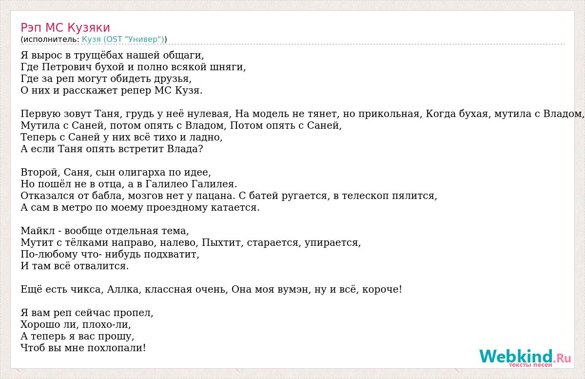 Я вырос в трущёбах нашей общаги, Где Петрович бухой и полно всякой шняги, Где за реп могут обидеть друзья, О них и расскажет репер МС Кузя. Первую зовут Таня, грудь у неё нулевая, На модель не тянет, но прикольная, Когда бухая, мутила с Владом, Мутила с Саней, потом опять с Владом, Потом опять с Саней, Теперь с Саней у них всё тихо и ладно, А если Таня опять встретит Влада? Второй, Саня, сын олигарха по идее, Но пошёл не в отца, а в Галилео Галилея. Отказался от бабла, мозгов нет у пацана. С батей ругается, в телескоп пялится, А сам в метро по моему проездному катается. Майкл - вообще отдельная тема, Мутит с тёлками направо, налево, Пыхтит, старается, упирается, По-любому что- нибудь подхватит, И там всё отвалится. Ещё есть чикса, Аллка, классная очень, Она моя вумэн, ну и всё, короче! Я вам реп сейчас пропел, Хорошо ли, плохо-ли, А теперь я вас прошу, Чтоб вы мне похлопали!