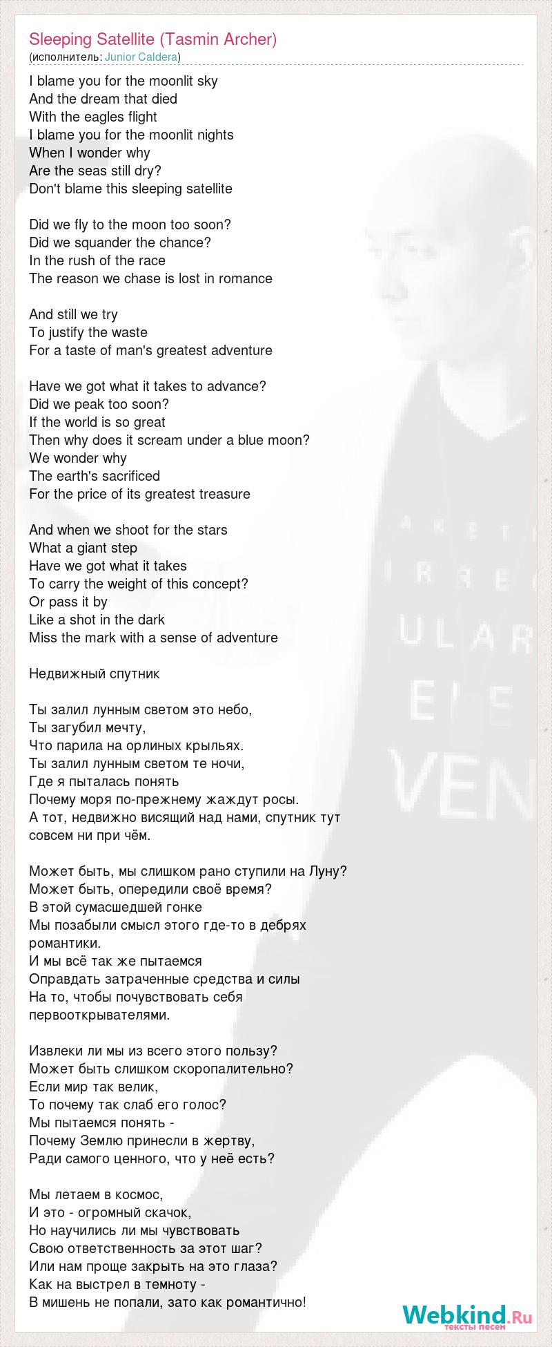 I blame you for the moonlit sky And the dream that died With the eagles flight I blame you for the moonlit nights When I wonder why Are the seas still dry? Don't blame this sleeping satellite Did we fly to the moon too soon? Did we squander the chance? In the rush of the race The reason we chase is lost in romance And still we try To justify the waste For a taste of man's greatest adventure Have we got what it takes to advance? Did we peak too soon? If the world is so great Then why does it scream under a blue moon? We wonder why The earth's sacrificed For the price of its greatest treasure And when we shoot for the stars What a giant step Have we got what it takes To carry the weight of this concept? Or pass it by Like a shot in the dark Miss the mark with a sense of adventure Недвижный спутник Ты залил лунным светом это небо, Ты загубил мечту, Что парила на орлиных крыльях. Ты залил лунным светом те ночи, Где я пыталась понять Почему моря по-прежнему жаждут росы. А тот, недвижно висящий над нами, спутник тут совсем ни при чём. Может быть, мы слишком рано ступили на Луну? Может быть, опередили своё время? В этой сумасшедшей гонке Мы позабыли смысл этого где-то в дебрях романтики. И мы всё так же пытаемся Оправдать затраченные средства и силы На то, чтобы почувствовать себя первооткрывателями. Извлеки ли мы из всего этого пользу? Может быть слишком скоропалительно? Если мир так велик, То почему так слаб его голос? Мы пытаемся понять - Почему Землю принесли в жертву, Ради самого ценного, что у неё есть? Мы летаем в космос, И это - огромный скачок, Но научились ли мы чувствовать Свою ответственность за этот шаг? Или нам проще закрыть на это глаза? Как на выстрел в темноту - В мишень не попали, зато как романтично!
