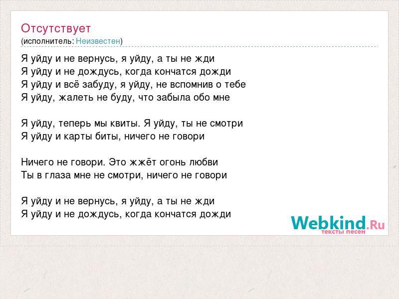 Я уйду и не вернусь, я уйду, а ты не жди Я уйду и не дождусь, когда кончатся дожди Я уйду и всё забуду, я уйду, не вспомнив о тебе Я уйду, жалеть не буду, что забыла обо мне Я уйду, теперь мы квиты. Я уйду, ты не смотри Я уйду и карты биты, ничего не говори Ничего не говори. Это жжёт огонь любви Ты в глаза мне не смотри, ничего не говори Я уйду и не вернусь, я уйду, а ты не жди Я уйду и не дождусь, когда кончатся дожди