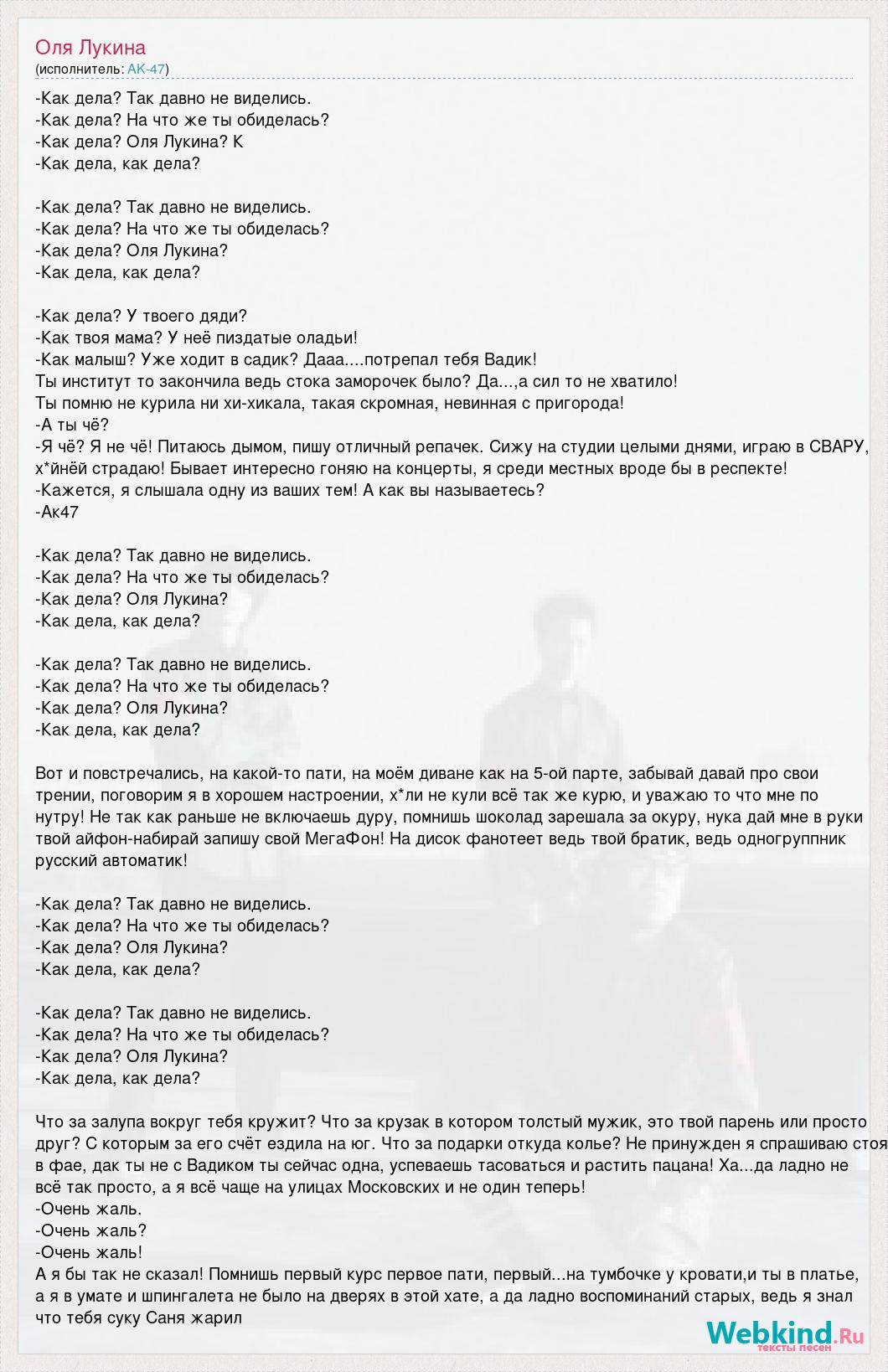 -Как дела? Так давно не виделись. -Как дела? На что же ты обиделась? -Как дела? Оля Лукина? К -Как дела, как дела? -Как дела? Так давно не виделись. -Как дела? На что же ты обиделась? -Как дела? Оля Лукина? -Как дела, как дела? -Как дела? У твоего дяди? -Как твоя мама? У неё пиздатые оладьи! -Как малыш? Уже ходит в садик? Дааа....потрепал тебя Вадик! Ты институт то закончила ведь стока заморочек было? Да...,а сил то не хватило! Ты помню не курила ни хи-хикала, такая скромная, невинная с пригорода! -А ты чё? -Я чё? Я не чё! Питаюсь дымом, пишу отличный репачек. Сижу на студии целыми днями, играю в СВАРУ, х*йнёй страдаю! Бывает интересно гоняю на концерты, я среди местных вроде бы в респекте! -Кажется, я слышала одну из ваших тем! А как вы называетесь? -Ак47 -Как дела? Так давно не виделись. -Как дела? На что же ты обиделась? -Как дела? Оля Лукина? -Как дела, как дела? -Как дела? Так давно не виделись. -Как дела? На что же ты обиделась? -Как дела? Оля Лукина? -Как дела, как дела? Вот и повстречались, на какой-то пати, на моём диване как на 5-ой парте, забывай давай про свои трении, поговорим я в хорошем настроении, х*ли не кули всё так же курю, и уважаю то что мне по нутру! Не так как раньше не включаешь дуру, помнишь шоколад зарешала за окуру, нука дай мне в руки твой айфон-набирай запишу свой МегаФон! На дисок фанотеет ведь твой братик, ведь одногруппник русский автоматик! -Как дела? Так давно не виделись. -Как дела? На что же ты обиделась? -Как дела? Оля Лукина? -Как дела, как дела? -Как дела? Так давно не виделись. -Как дела? На что же ты обиделась? -Как дела? Оля Лукина? -Как дела, как дела? Что за залупа вокруг тебя кружит? Что за крузак в котором толстый мужик, это твой парень или просто друг? С которым за его счёт ездила на юг. Что за подарки откуда колье? Не принужден я спрашиваю стоя в фае, дак ты не с Вадиком ты сейчас одна, успеваешь тасоваться и растить пацана! Ха...да ладно не всё так просто, а я всё чаще на улицах Московских и не один теперь! -Очень жаль. -Очень жаль? -Очень жаль! А я бы так не сказал! Помнишь первый курс первое пати, первый...на тумбочке у кровати,и ты в платье, а я в умате и шпингалета не было на дверях в этой хате, а да ладно воспоминаний старых, ведь я знал что тебя суку Саня жарил