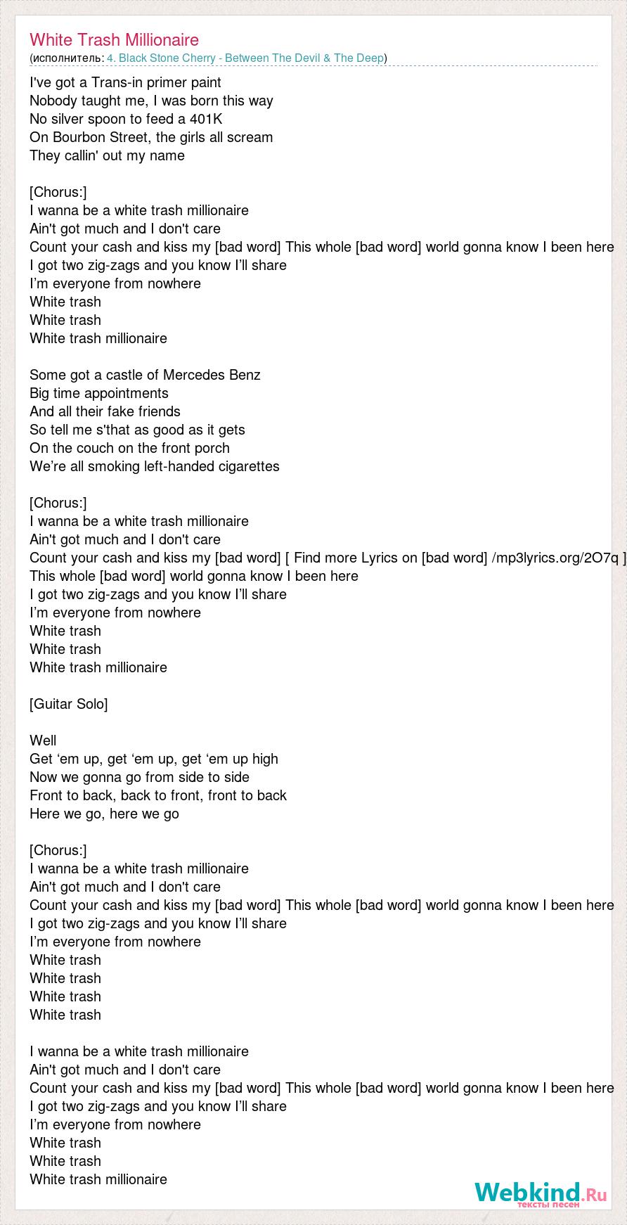 I've got a Trans-in primer paint Nobody taught me, I was born this way No silver spoon to feed a 401K On Bourbon Street, the girls all scream They callin' out my name [Chorus:] I wanna be a white trash millionaire Ain't got much and I don't care Count your cash and kiss my [bad word] This whole [bad word] world gonna know I been here I got two zig-zags and you know I’ll share I’m everyone from nowhere White trash White trash White trash millionaire Some got a castle of Mercedes Benz Big time appointments And all their fake friends So tell me s'that as good as it gets On the couch on the front porch We’re all smoking left-handed cigarettes [Chorus:] I wanna be a white trash millionaire Ain't got much and I don't care Count your cash and kiss my [bad word] [ Find more Lyrics on [bad word] /mp3lyrics.org/2O7q ] This whole [bad word] world gonna know I been here I got two zig-zags and you know I’ll share I’m everyone from nowhere White trash White trash White trash millionaire [Guitar Solo] Well Get ‘em up, get ‘em up, get ‘em up high Now we gonna go from side to side Front to back, back to front, front to back Here we go, here we go [Chorus:] I wanna be a white trash millionaire Ain't got much and I don't care Count your cash and kiss my [bad word] This whole [bad word] world gonna know I been here I got two zig-zags and you know I’ll share I’m everyone from nowhere White trash White trash White trash White trash I wanna be a white trash millionaire Ain't got much and I don't care Count your cash and kiss my [bad word] This whole [bad word] world gonna know I been here I got two zig-zags and you know I’ll share I’m everyone from nowhere White trash White trash White trash millionaire