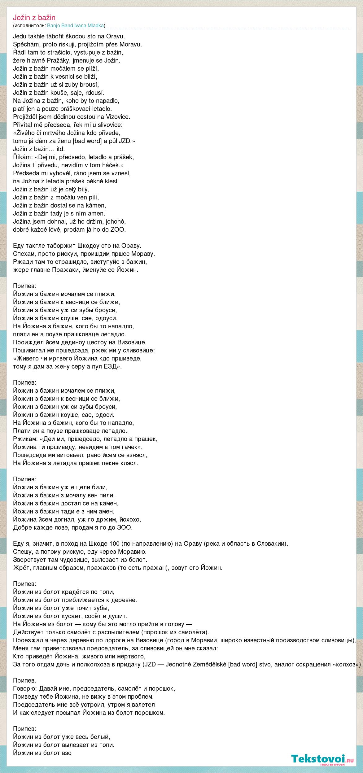 Jedu takhle tábořit škodou sto na Oravu. Spěchám, proto riskuji, projíždím přes Moravu. Řádí tam to strašidlo, vystupuje z bažin, žere hlavně Pražáky, jmenuje se Jožin. Jožin z bažin močálem se plíží, Jožin z bažin k vesnici se blíží, Jožin z bažin už si zuby brousí, Jožin z bažin kouše, saje, rdousí. Na Jožina z bažin, koho by to napadlo, platí jen a pouze práškovací letadlo. Projížděl jsem dědinou cestou na Vizovice. Přivítal mě předseda, řek mi u slivovice: «Živého či mrtvého Jožina kdo přivede, tomu já dám za ženu dceru a půl JZD.» Jožin z bažin… itd. Říkám: «Dej mi, předsedo, letadlo a prášek, Jožina ti přivedu, nevidím v tom háček.» Předseda mi vyhověl, ráno jsem se vznesl, na Jožina z letadla prášek pěkně klesl. Jožin z bažin už je celý bílý, Jožin z bažin z močálu ven pílí, Jožin z bažin dostal se na kámen, Jožin z bažin tady je s ním amen. Jožina jsem dohnal, už ho držím, johohó, dobré každé lóvé, prodám já ho do ZOO. Еду такгле таборжит Шкодоу сто на Ораву. Спехам, прото рискуи, проишдим пршес Мораву. Ржади там то страшидло, виступуйе з бажин, жере главне Пражаки, йменуйе се Йожин. Припев: Йожин з бажин мочалем се плижи, Йожин з бажин к весници се ближи, Йожин з бажин уж си зубы броуси, Йожин з бажин коуше, сае, рдоуси. На Йожина з бажин, кого бы то нападло, плати ен а поузе прашковаце летадло. Проиждел йсем дединоу цестоу на Визовице. Пршивитал ме пршедсэда, ржек ми у сливовице: «Живего чи мртвего Йожина кдо пршиведе, тому я дам за жену серу а пул ЕЗД». Припев: Йожин з бажин мочалем се плижи, Йожин з бажин к весници се ближи, Йожин з бажин уж си зубы броуси, Йожин з бажин коуше, сае, рдоси. На Йожина з бажин, кого бы то нападло, Плати ен а поузе прашковаце летадло. Ржикам: «Дей ми, пршедседо, летадло а прашек, Йожина ти пршиведу, невидим в том гачек». Пршедседа ми виговьел, рано йсем се взнэсл, На Йожина з летадла прашек пекне клэсл. Припев: Йожин з бажин уж е цели били, Йожин з бажин з мочалу вен пили, Йожин з бажин достал се на камен, Йожин з бажин тади е з ним амен. Йожина йсем догнал, уж го држим, йохохо, Добре кажде лове, продам я го до ЗОО. Еду я, значит, в поход на Шкоде 100 (по направлению) на Ораву (река и область в Словакии). Спешу, а потому рискую, еду через Моравию. Зверствует там чудовище, вылезает из болот. Жрёт, главным образом, пражаков (то есть пражан), зовут его Йожин. Припев: Йожин из болот крадётся по топи, Йожин из болот приближается к деревне. Йожин из болот уже точит зубы, Йожин из болот кусает, сосёт и душит. На Йожина из болот — кому бы это могло прийти в голову — Действует только самолёт с распылителем (порошок из самолёта). Проезжал я через деревню по дороге на Визовице (город в Моравии, широко известный производством сливовицы), Меня там приветствовал председатель, за сливовицей он мне сказал: Кто приведёт Йожина, живого или мёртвого, За того отдам дочь и полколхоза в придачу (JZD — Jednotné Zemědělské Družstvo, аналог сокращения «колхоз»). Припев. Говорю: Давай мне, председатель, самолёт и порошок, Приведу тебе Йожина, не вижу в этом проблем. Председатель мне всё устроил, утром я взлетел И как следует посыпал Йожина из болот порошком. Припев: Йожин из болот уже весь белый, Йожин из болот вылезает из топи. Йожин из болот взо