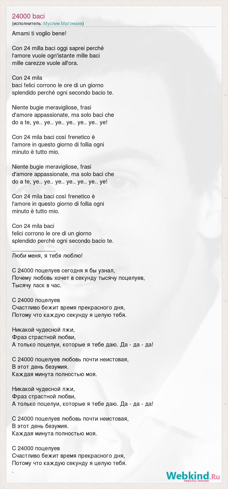 Amami ti voglio bene! Con 24 milla baci oggi saprei perché l'amore vuole ogn'istante mille baci mille carezze vuole all'ora. Con 24 mila baci felici corrono le ore di un giorno splendido perché ogni secondo bacio te. Niente bugie meravigliose, frasi d'amore appassionate, ma solo baci che do a te, ye.. ye.. ye.. ye.. ye.. ye.. ye! Con 24 mila baci così frenetico è l'amore in questo giorno di follia ogni minuto è tutto mio. Niente bugie meravigliose, frasi d'amore appassionate, ma solo baci che do a te, ye.. ye.. ye.. ye.. ye.. ye.. ye! Con 24 mila baci così frenetico è l'amore in questo giorno di follia ogni minuto è tutto mio. Con 24 mila baci felici corrono le ore di un giorno splendido perchè ogni secondo bacio te. ______________ Люби меня, я тебя люблю! С 24000 поцелуев cегодня я бы узнал, Почему любовь хочет в секунду тысячу поцелуев, Тысячу ласк в час. С 24000 поцелуев Счастливо бежит время прекрасного дня, Потому что каждую секунду я целую тебя. Никакой чудесной лжи, Фраз страстной любви, А только поцелуи, которые я тебе даю. Да - да - да! С 24000 поцелуев любовь почти неистовая, В этот день безумия. Каждая минута полностью моя. Никакой чудесной лжи, Фраз страстной любви, А только поцелуи, которые я тебе даю. Да - да - да! С 24000 поцелуев любовь почти неистовая, В этот день безумия. Каждая минута полностью моя. С 24000 поцелуев Счастливо бежит время прекрасного дня, Потому что каждую секунду я целую тебя. .