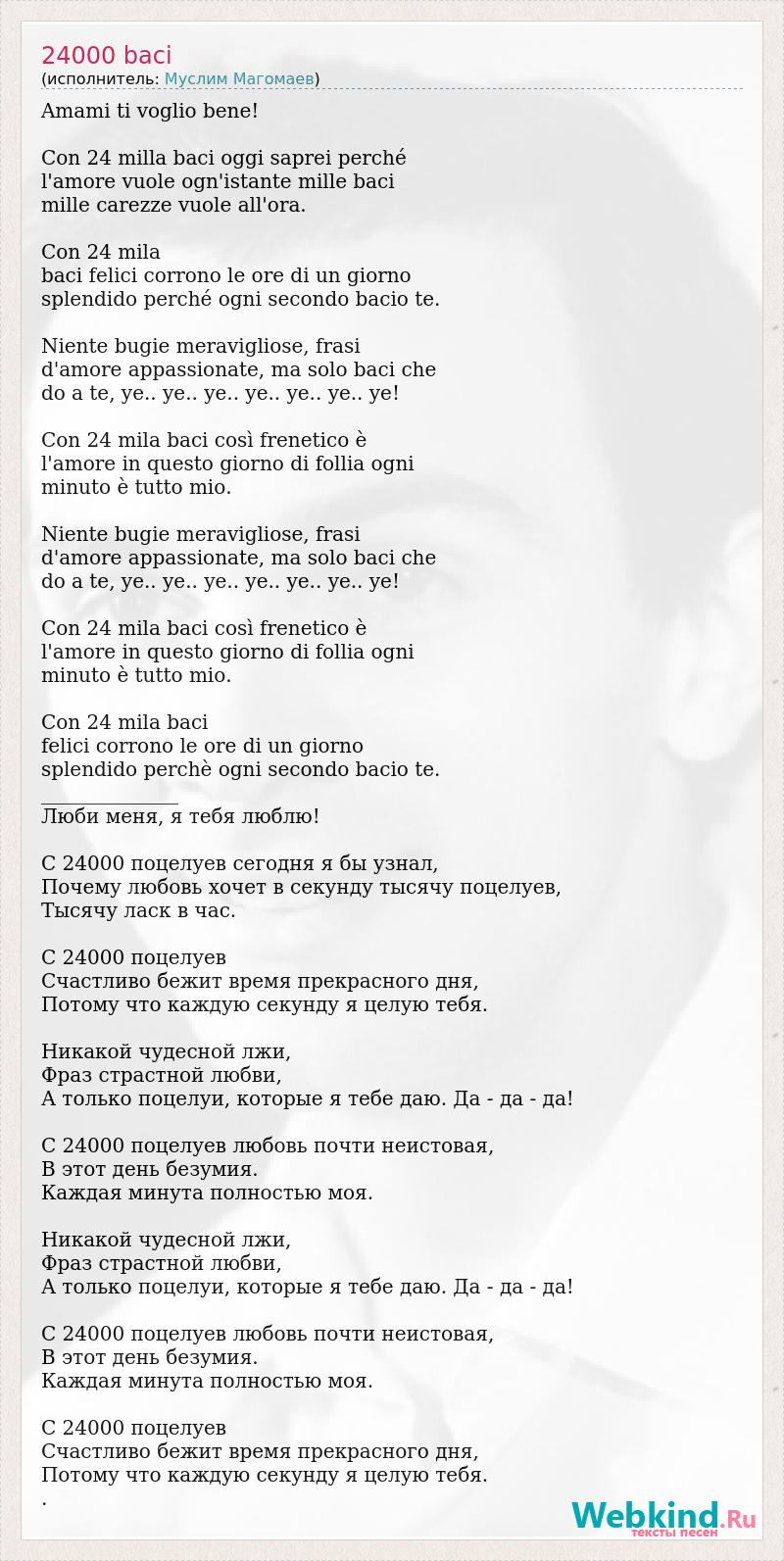 Amami ti voglio bene! Con 24 milla baci oggi saprei perché l'amore vuole ogn'istante mille baci mille carezze vuole all'ora. Con 24 mila baci felici corrono le ore di un giorno splendido perché ogni secondo bacio te. Niente bugie meravigliose, frasi d'amore appassionate, ma solo baci che do a te, ye.. ye.. ye.. ye.. ye.. ye.. ye! Con 24 mila baci così frenetico è l'amore in questo giorno di follia ogni minuto è tutto mio. Niente bugie meravigliose, frasi d'amore appassionate, ma solo baci che do a te, ye.. ye.. ye.. ye.. ye.. ye.. ye! Con 24 mila baci così frenetico è l'amore in questo giorno di follia ogni minuto è tutto mio. Con 24 mila baci felici corrono le ore di un giorno splendido perchè ogni secondo bacio te. ______________ Люби меня, я тебя люблю! С 24000 поцелуев cегодня я бы узнал, Почему любовь хочет в секунду тысячу поцелуев, Тысячу ласк в час. С 24000 поцелуев Счастливо бежит время прекрасного дня, Потому что каждую секунду я целую тебя. Никакой чудесной лжи, Фраз страстной любви, А только поцелуи, которые я тебе даю. Да - да - да! С 24000 поцелуев любовь почти неистовая, В этот день безумия. Каждая минута полностью моя. Никакой чудесной лжи, Фраз страстной любви, А только поцелуи, которые я тебе даю. Да - да - да! С 24000 поцелуев любовь почти неистовая, В этот день безумия. Каждая минута полностью моя. С 24000 поцелуев Счастливо бежит время прекрасного дня, Потому что каждую секунду я целую тебя. .