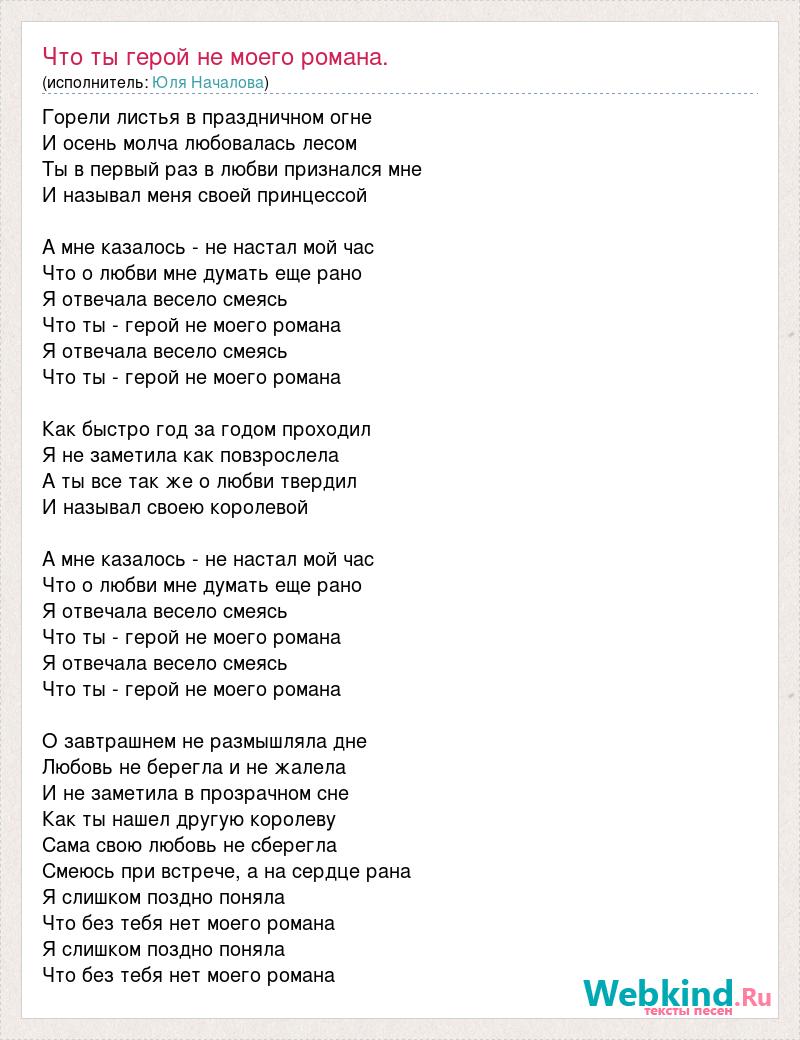 Горели листья в праздничном огне И осень молча любовалась лесом Ты в первый раз в любви признался мне И называл меня своей принцессой А мне казалось - не настал мой час Что о любви мне думать еще рано Я отвечала весело смеясь Что ты - герой не моего романа Я отвечала весело смеясь Что ты - герой не моего романа Как быстро год за годом проходил Я не заметила как повзрослела А ты все так же о любви твердил И называл своею королевой А мне казалось - не настал мой час Что о любви мне думать еще рано Я отвечала весело смеясь Что ты - герой не моего романа Я отвечала весело смеясь Что ты - герой не моего романа О завтрашнем не размышляла дне Любовь не берегла и не жалела И не заметила в прозрачном сне Как ты нашел другую королеву Сама свою любовь не сберегла Смеюсь при встрече, а на сердце рана Я слишком поздно поняла Что без тебя нет моего романа Я слишком поздно поняла Что без тебя нет моего романа