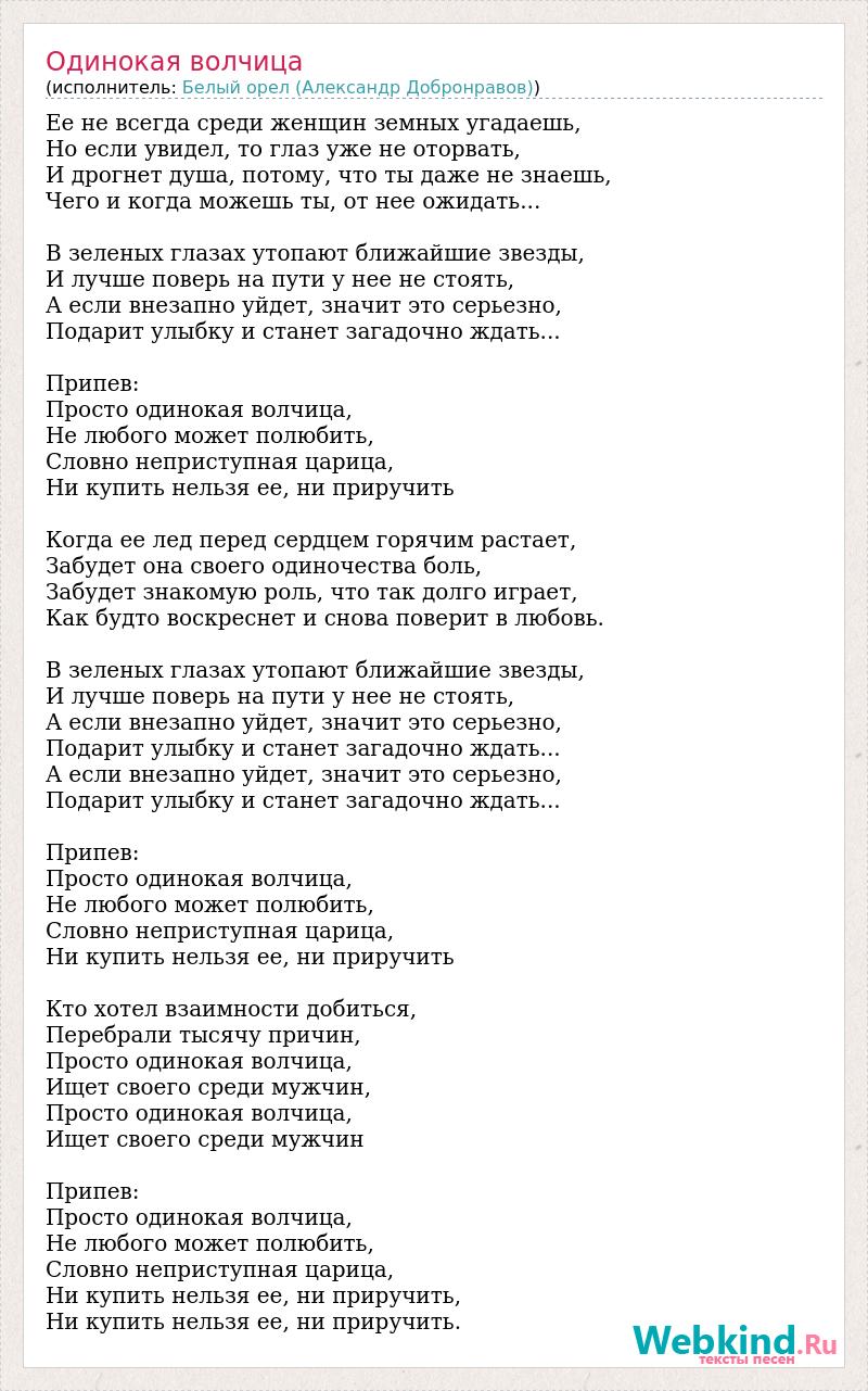 Ее не всегда среди женщин земных угадаешь, Но если увидел, то глаз уже не оторвать, И дрогнет душа, потому, что ты даже не знаешь, Чего и когда можешь ты, от нее ожидать... В зеленых глазах утопают ближайшие звезды, И лучше поверь на пути у нее не стоять, А если внезапно уйдет, значит это серьезно, Подарит улыбку и станет загадочно ждать... Припев: Просто одинокая волчица, Не любого может полюбить, Словно неприступная царица, Ни купить нельзя ее, ни приручить Когда ее лед перед сердцем горячим растает, Забудет она своего одиночества боль, Забудет знакомую роль, что так долго играет, Как будто воскреснет и снова поверит в любовь. В зеленых глазах утопают ближайшие звезды, И лучше поверь на пути у нее не стоять, А если внезапно уйдет, значит это серьезно, Подарит улыбку и станет загадочно ждать... А если внезапно уйдет, значит это серьезно, Подарит улыбку и станет загадочно ждать... Припев: Просто одинокая волчица, Не любого может полюбить, Словно неприступная царица, Ни купить нельзя ее, ни приручить Кто хотел взаимности добиться, Перебрали тысячу причин, Просто одинокая волчица, Ищет своего среди мужчин, Просто одинокая волчица, Ищет своего среди мужчин Припев: Просто одинокая волчица, Не любого может полюбить, Словно неприступная царица, Ни купить нельзя ее, ни приручить, Ни купить нельзя ее, ни приручить.