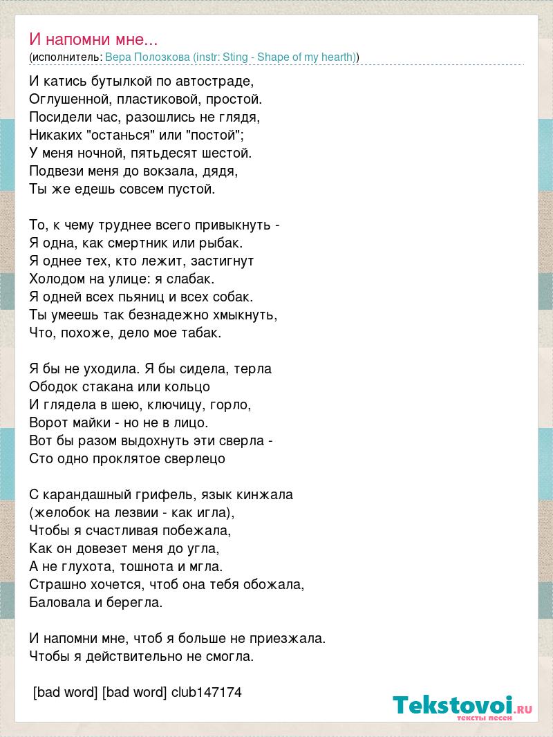 И катись бутылкой по автостраде, Оглушенной, пластиковой, простой. Посидели час, разошлись не глядя, Никаких "останься" или "постой"; У меня ночной, пятьдесят шестой. Подвези меня до вокзала, дядя, Ты же едешь совсем пустой. То, к чему труднее всего привыкнуть - Я одна, как смертник или рыбак. Я однее тех, кто лежит, застигнут Холодом на улице: я слабак. Я одней всех пьяниц и всех собак. Ты умеешь так безнадежно хмыкнуть, Что, похоже, дело мое табак. Я бы не уходила. Я бы сидела, терла Ободок стакана или кольцо И глядела в шею, ключицу, горло, Ворот майки - но не в лицо. Вот бы разом выдохнуть эти сверла - Сто одно проклятое сверлецо С карандашный грифель, язык кинжала (желобок на лезвии - как игла), Чтобы я счастливая побежала, Как он довезет меня до угла, А не глухота, тошнота и мгла. Страшно хочется, чтоб она тебя обожала, Баловала и берегла. И напомни мне, чтоб я больше не приезжала. Чтобы я действительно не смогла. [bad word] [bad word] club147174