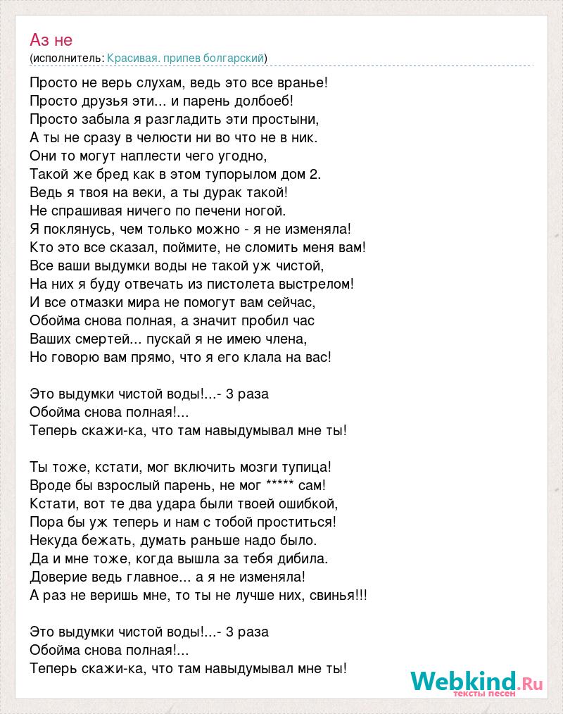 Просто не верь слухам, ведь это все вранье! Просто друзья эти... и парень долбоеб! Просто забыла я разгладить эти простыни, А ты не сразу в челюсти ни во что не в ник. Они то могут наплести чего угодно, Такой же бред как в этом тупорылом дом 2. Ведь я твоя на веки, а ты дурак такой! Не спрашивая ничего по печени ногой. Я поклянусь, чем только можно - я не изменяла! Кто это все сказал, поймите, не сломить меня вам! Все ваши выдумки воды не такой уж чистой, На них я буду отвечать из пистолета выстрелом! И все отмазки мира не помогут вам сейчас, Обойма снова полная, а значит пробил час Ваших смертей... пускай я не имею члена, Но говорю вам прямо, что я его клала на вас! Это выдумки чистой воды!...- 3 раза Обойма снова полная!... Теперь скажи-ка, что там навыдумывал мне ты! Ты тоже, кстати, мог включить мозги тупица! Вроде бы взрослый парень, не мог ***** сам! Кстати, вот те два удара были твоей ошибкой, Пора бы уж теперь и нам с тобой проститься! Некуда бежать, думать раньше надо было. Да и мне тоже, когда вышла за тебя дибила. Доверие ведь главное... а я не изменяла! А раз не веришь мне, то ты не лучше них, свинья!!! Это выдумки чистой воды!...- 3 раза Обойма снова полная!... Теперь скажи-ка, что там навыдумывал мне ты!