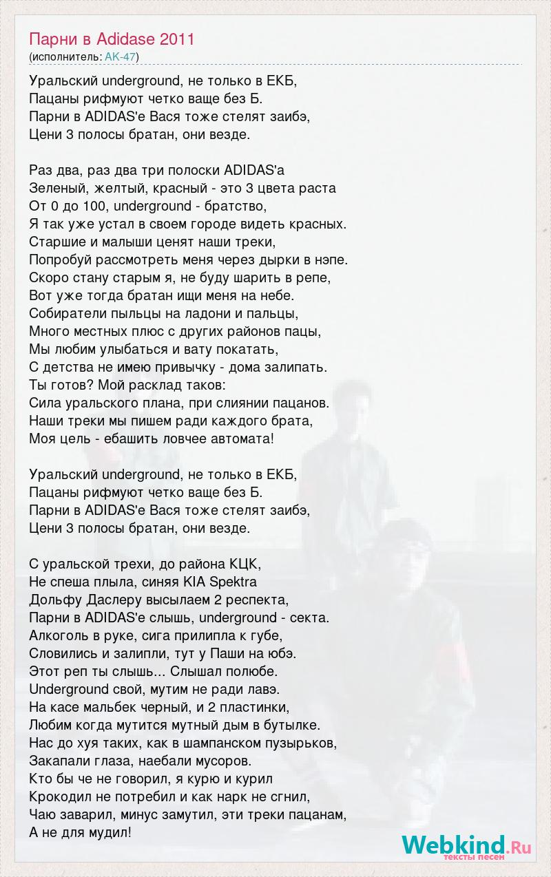Уральский underground, не только в ЕКБ, Пацаны рифмуют четко ваще без Б. Парни в ADIDAS'e Вася тоже стелят заибэ, Цени 3 полосы братан, они везде. Раз два, раз два три полоски ADIDAS'a Зеленый, желтый, красный - это 3 цвета раста От 0 до 100, underground - братство, Я так уже устал в своем городе видеть красных. Старшие и малыши ценят наши треки, Попробуй рассмотреть меня через дырки в нэпе. Скоро стану старым я, не буду шарить в репе, Вот уже тогда братан ищи меня на небе. Собиратели пыльцы на ладони и пальцы, Много местных плюс с других районов пацы, Мы любим улыбаться и вату покатать, С детства не имею привычку - дома залипать. Ты готов? Мой расклад таков: Сила уральского плана, при слиянии пацанов. Наши треки мы пишем ради каждого брата, Моя цель - ебашить ловчее автомата! Уральский underground, не только в ЕКБ, Пацаны рифмуют четко ваще без Б. Парни в ADIDAS'e Вася тоже стелят заибэ, Цени 3 полосы братан, они везде. С уральской трехи, до района КЦК, Не спеша плыла, синяя KIA Spektra Дольфу Даслеру высылаем 2 респекта, Парни в ADIDAS'e слышь, underground - секта. Алкоголь в руке, сига прилипла к губе, Словились и залипли, тут у Паши на юбэ. Этот реп ты слышь... Слышал полюбе. Underground свой, мутим не ради лавэ. На касе мальбек черный, и 2 пластинки, Любим когда мутится мутный дым в бутылке. Нас до хуя таких, как в шампанском пузырьков, Закапали глаза, наебали мусоров. Кто бы че не говорил, я курю и курил Крокодил не потребил и как нарк не сгнил, Чаю заварил, минус замутил, эти треки пацанам, А не для мудил!