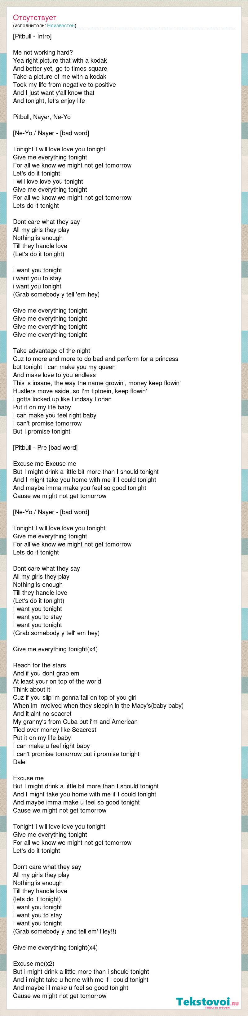 [Pitbull - Intro] Me not working hard? Yea right picture that with a kodak And better yet, go to times square Take a picture of me with a kodak Took my life from negative to positive And I just want y'all know that And tonight, let's enjoy life Pitbull, Nayer, Ne-Yo [Ne-Yo / Nayer - Chorus] Tonight I will love love you tonight Give me everything tonight For all we know we might not get tomorrow Let's do it tonight I will love love you tonight Give me everything tonight For all we know we might not get tomorrow Lets do it tonight Dont care what they say All my girls they play Nothing is enough Till they handle love (Let's do it tonight) I want you tonight i want you to stay i want you tonight (Grab somebody y tell 'em hey) Give me everything tonight Give me everything tonight Give me everything tonight Give me everything tonight Take advantage of the night Cuz to more and more to do bad and perform for a princess but tonight I can make you my queen And make love to you endless This is insane, the way the name growin', money keep flowin' Hustlers move aside, so I'm tiptoein, keep flowin' I gotta locked up like Lindsay Lohan Put it on my life baby I can make you feel right baby I can't promise tomorrow But I promise tonight [Pitbull - Pre Chorus] Excuse me Excuse me But I might drink a little bit more than I should tonight And I might take you home with me if I could tonight And maybe imma make you feel so good tonight Cause we might not get tomorrow [Ne-Yo / Nayer - Chorus] Tonight I will love love you tonight Give me everything tonight For all we know we might not get tomorrow Lets do it tonight Dont care what they say All my girls they play Nothing is enough Till they handle love (Let's do it tonight) I want you tonight I want you to stay I want you tonight (Grab somebody y tell' em hey) Give me everything tonight(x4) Reach for the stars And if you dont grab em At least your on top of the world Think about it Cuz if you slip im gonna fall on top of you girl When im involved when they sleepin in the Macy's(baby baby) And it aint no seacret My granny's from Cuba but i'm and American Tied over money like Seacrest Put it on my life baby I can make u feel right baby I can't promise tomorrow but i promise tonight Dale Excuse me But I might drink a little bit more than I should tonight And I might take you home with me if I could tonight And maybe imma make u feel so good tonight Cause we might not get tomorrow Tonight I will love love you tonight Give me everything tonight For all we know we might not get tomorrow Let's do it tonight Don't care what they say All my girls they play Nothing is enough Till they handle love (lets do it tonight) I want you tonight I want you to stay I want you tonight (Grab somebody y and tell em' Hey!!) Give me everything tonight(x4) Excuse me(x2) But i might drink a little more than i should tonight And i might take u home with me if i could tonight And maybe ill make u feel so good tonight Cause we might not get tomorrow