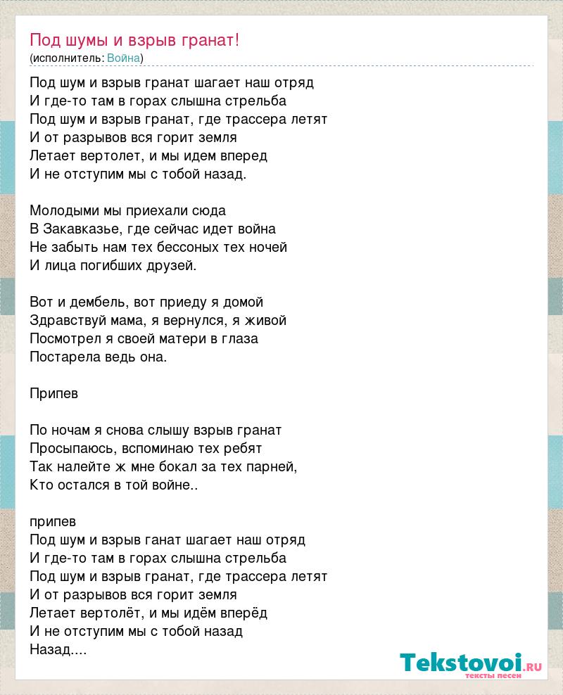 Под шум и взрыв гранат шагает наш отряд И где-то там в горах слышна стрельба Под шум и взрыв гранат, где трассера летят И от разрывов вся горит земля Летает вертолет, и мы идем вперед И не отступим мы с тобой назад. Молодыми мы приехали сюда В Закавказье, где сейчас идет война Не забыть нам тех бессоных тех ночей И лица погибших друзей. Вот и дембель, вот приеду я домой Здравствуй мама, я вернулся, я живой Посмотрел я своей матери в глаза Постарела ведь она. Припев По ночам я снова слышу взрыв гранат Просыпаюсь, вспоминаю тех ребят Так налейте ж мне бокал за тех парней, Кто остался в той войне.. припев Под шум и взрыв ганат шагает наш отряд И где-то там в горах слышна стрельба Под шум и взрыв гранат, где трассера летят И от разрывов вся горит земля Летает вертолёт, и мы идём вперёд И не отступим мы с тобой назад Назад....