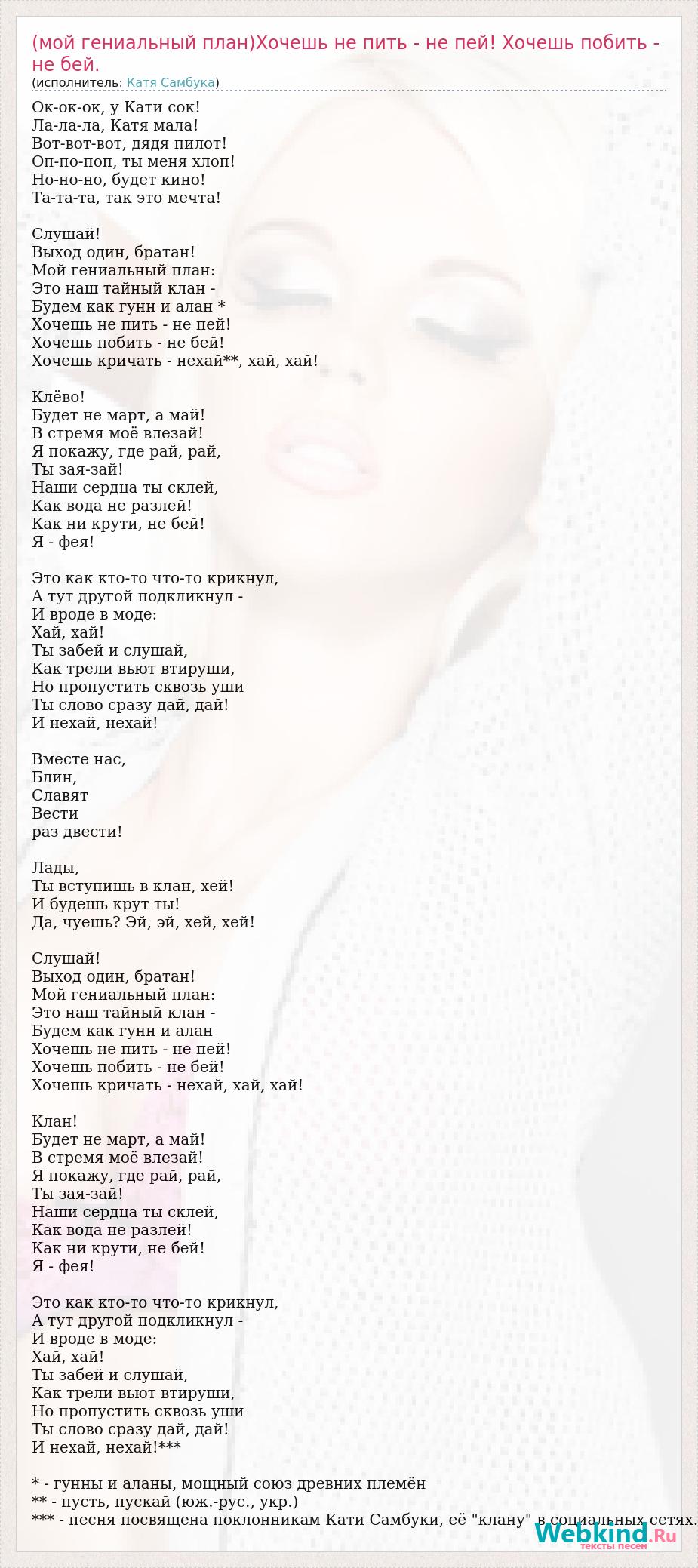 Oк-oк-ок, у Кати сок! Ла-ла-ла, Катя мала! Вот-вот-вот, дядя пилот! Оп-по-поп, ты меня хлоп! Но-но-но, будет кино! Та-та-та, так это мечта! Слушай! Выход один, братан! Мой гениальный план: Это наш тайный клан - Будем как гунн и алан * Хочешь не пить - не пей! Хочешь побить - не бей! Хочешь кричать - нехай**, хай, хай! Клёво! Будет не март, а май! В стремя моё влезай! Я покажу, где рай, рай, Ты зая-зай! Наши сердца ты склей, Как вода не разлей! Как ни крути, не бей! Я - фея! Это как кто-то что-то крикнул, А тут другой подкликнул - И вроде в моде: Хай, хай! Ты забей и слушай, Как трели вьют втируши, Но пропустить сквозь уши Ты слово сразу дай, дай! И нехай, нехай! Вместе нас, Блин, Славят Вести раз двести! Лады, Ты вступишь в клан, хей! И будешь крут ты! Да, чуешь? Эй, эй, хей, хей! Слушай! Выход один, братан! Мой гениальный план: Это наш тайный клан - Будем как гунн и алан Хочешь не пить - не пей! Хочешь побить - не бей! Хочешь кричать - нехай, хай, хай! Клан! Будет не март, а май! В стремя моё влезай! Я покажу, где рай, рай, Ты зая-зай! Наши сердца ты склей, Как вода не разлей! Как ни крути, не бей! Я - фея! Это как кто-то что-то крикнул, А тут другой подкликнул - И вроде в моде: Хай, хай! Ты забей и слушай, Как трели вьют втируши, Но пропустить сквозь уши Ты слово сразу дай, дай! И нехай, нехай!*** * - гунны и аланы, мощный союз древних племён ** - пусть, пускай (юж.-рус., укр.) *** - песня посвящена поклонникам Кати Самбуки, её "клану" в социальных сетях.