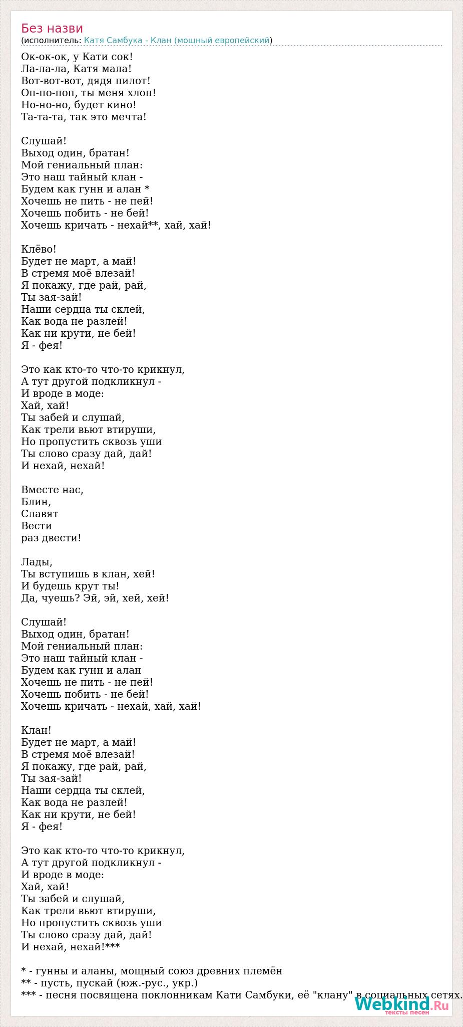Oк-oк-ок, у Кати сок! Ла-ла-ла, Катя мала! Вот-вот-вот, дядя пилот! Оп-по-поп, ты меня хлоп! Но-но-но, будет кино! Та-та-та, так это мечта! Слушай! Выход один, братан! Мой гениальный план: Это наш тайный клан - Будем как гунн и алан * Хочешь не пить - не пей! Хочешь побить - не бей! Хочешь кричать - нехай**, хай, хай! Клёво! Будет не март, а май! В стремя моё влезай! Я покажу, где рай, рай, Ты зая-зай! Наши сердца ты склей, Как вода не разлей! Как ни крути, не бей! Я - фея! Это как кто-то что-то крикнул, А тут другой подкликнул - И вроде в моде: Хай, хай! Ты забей и слушай, Как трели вьют втируши, Но пропустить сквозь уши Ты слово сразу дай, дай! И нехай, нехай! Вместе нас, Блин, Славят Вести раз двести! Лады, Ты вступишь в клан, хей! И будешь крут ты! Да, чуешь? Эй, эй, хей, хей! Слушай! Выход один, братан! Мой гениальный план: Это наш тайный клан - Будем как гунн и алан Хочешь не пить - не пей! Хочешь побить - не бей! Хочешь кричать - нехай, хай, хай! Клан! Будет не март, а май! В стремя моё влезай! Я покажу, где рай, рай, Ты зая-зай! Наши сердца ты склей, Как вода не разлей! Как ни крути, не бей! Я - фея! Это как кто-то что-то крикнул, А тут другой подкликнул - И вроде в моде: Хай, хай! Ты забей и слушай, Как трели вьют втируши, Но пропустить сквозь уши Ты слово сразу дай, дай! И нехай, нехай!*** * - гунны и аланы, мощный союз древних племён ** - пусть, пускай (юж.-рус., укр.) *** - песня посвящена поклонникам Кати Самбуки, её "клану" в социальных сетях.