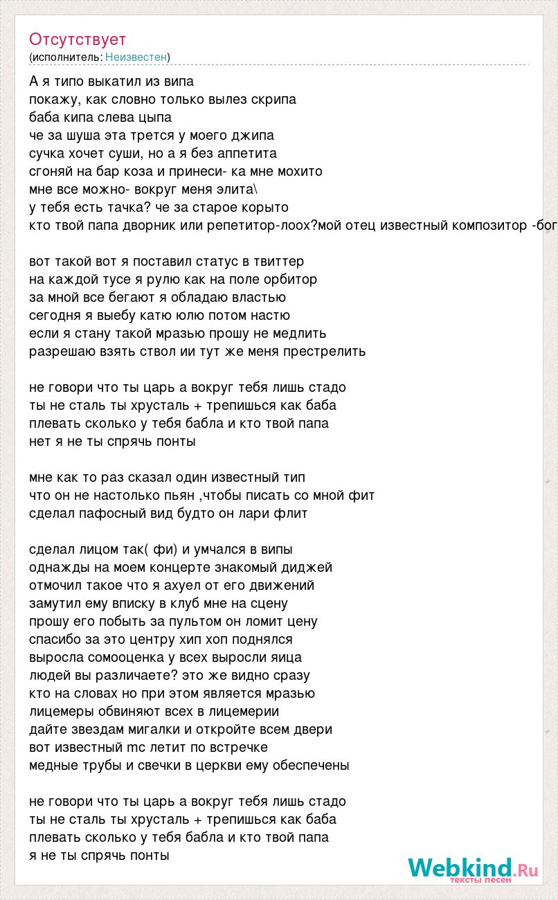 А я типо выкатил из випа покажу, как словно только вылез скрипа баба кипа слева цыпа че за шуша эта трется у моего джипа сучка хочет суши, но а я без аппетита сгоняй на бар коза и принеси- ка мне мохито мне все можно- вокруг меня элита\ у тебя есть тачка? че за старое корыто кто твой папа дворник или репетитор-лоох?мой отец известный композитор -бог вот такой вот я поставил статус в твиттер на каждой тусе я рулю как на поле орбитор за мной все бегают я обладаю властью сегодня я выебу катю юлю потом настю если я стану такой мразью прошу не медлить разрешаю взять ствол ии тут же меня престрелить не говори что ты царь а вокруг тебя лишь стадо ты не сталь ты хрусталь + трепишься как баба плевать сколько у тебя бабла и кто твой папа нет я не ты спрячь понты мне как то раз сказал один известный тип что он не настолько пьян ,чтобы писать со мной фит сделал пафосный вид будто он лари флит сделал лицом так( фи) и умчался в випы однажды на моем концерте знакомый диджей отмочил такое что я ахуел от его движений замутил ему вписку в клуб мне на сцену прошу его побыть за пультом он ломит цену спасибо за это центру хип хоп поднялся выросла сомооценка у всех выросли яица людей вы различаете? это же видно сразу кто на словах но при этом является мразью лицемеры обвиняют всех в лицемерии дайте звездам мигалки и откройте всем двери вот известный mc летит по встречке медные трубы и свечки в церкви ему обеспечены не говори что ты царь а вокруг тебя лишь стадо ты не сталь ты хрусталь + трепишься как баба плевать сколько у тебя бабла и кто твой папа я не ты спрячь понты