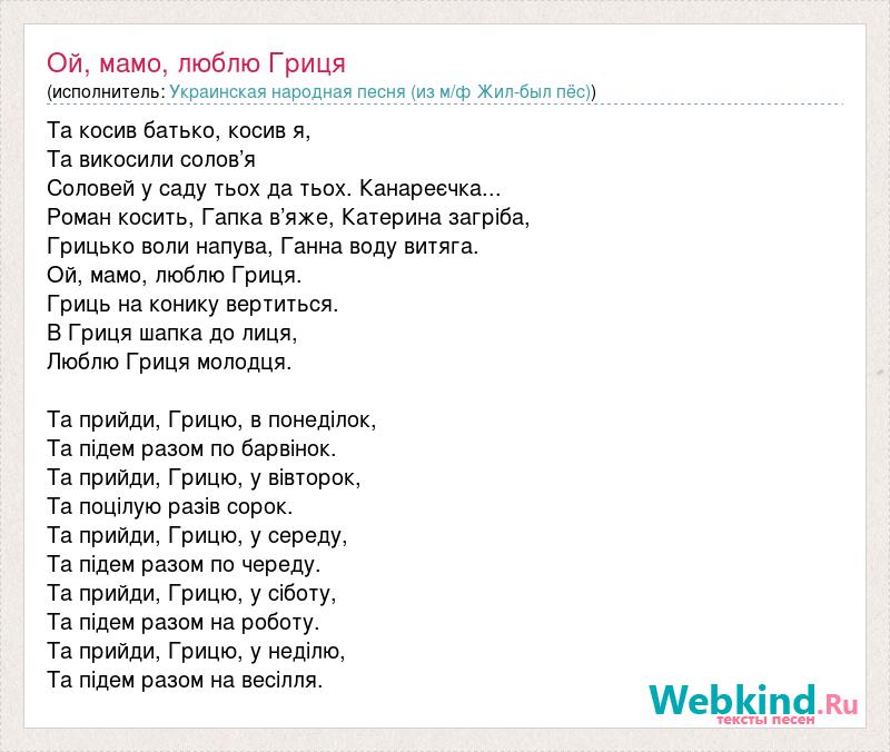 Та косив батько, косив я, Та викосили солов’я Соловей у саду тьох да тьох. Канареєчка... Роман косить, Гапка в’яже, Катерина загріба, Грицько воли напува, Ганна воду витяга. Ой, мамо, люблю Гриця. Гриць на конику вертиться. В Гриця шапка до лиця, Люблю Гриця молодця. Та прийди, Грицю, в понеділок, Та підем разом по барвінок. Та прийди, Грицю, у вівторок, Та поцілую разів сорок. Та прийди, Грицю, у середу, Та підем разом по череду. Та прийди, Грицю, у сіботу, Та підем разом на роботу. Та прийди, Грицю, у неділю, Та підем разом на весілля.